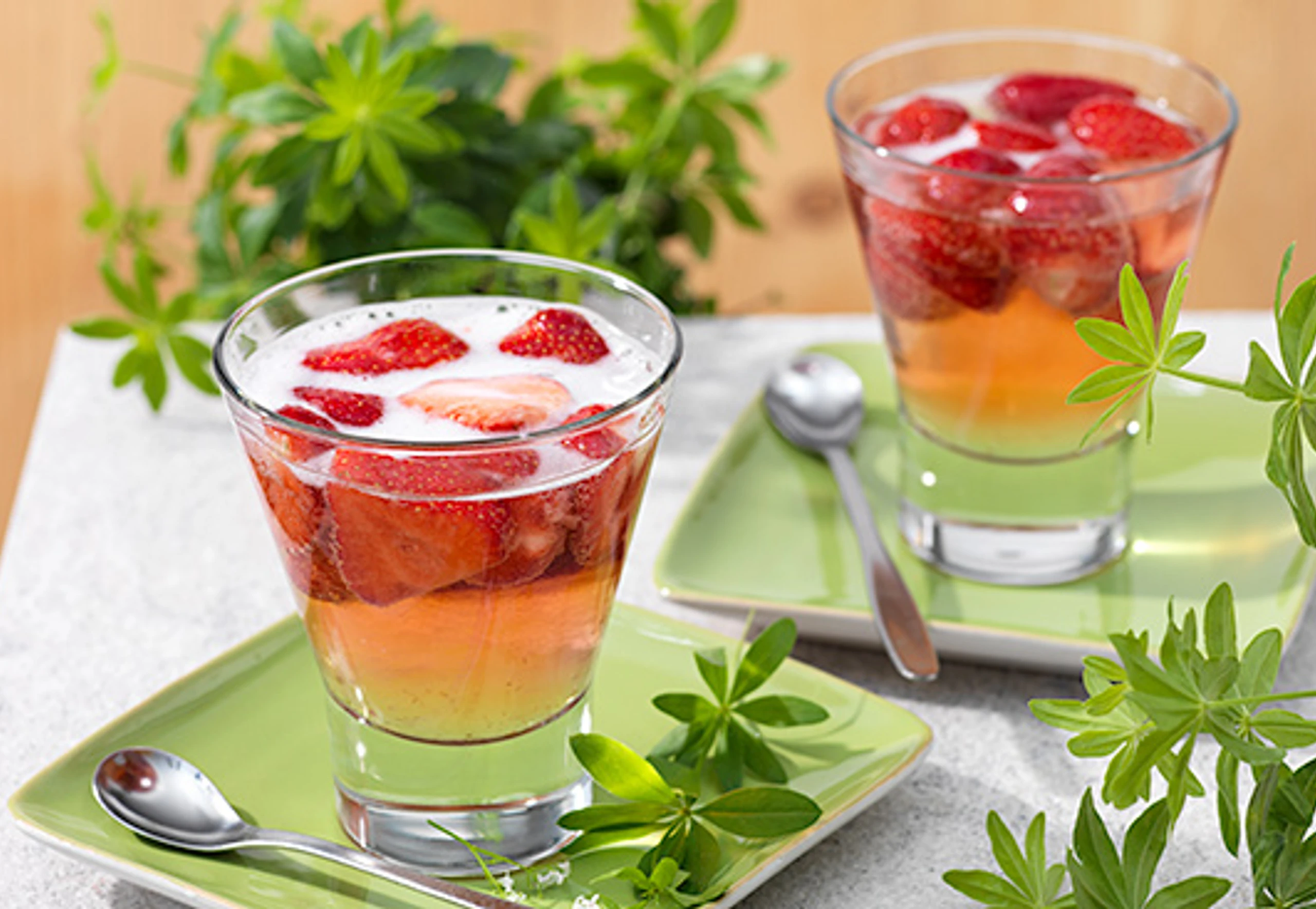 Prosecco mit Waldmeister und Erdbeeren