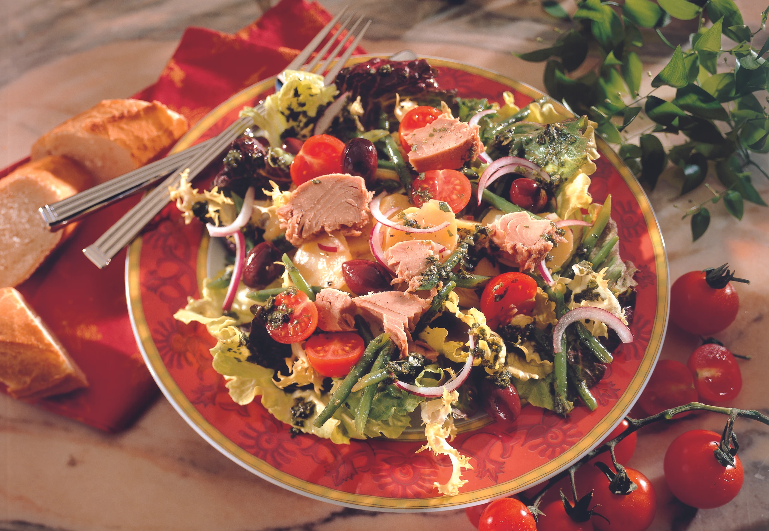 Blattsalate, Kartoffelsalat, Fisolen, Tomaten, Thunfisch, Oliven und Zwiebeln in eine Schüssel geben, mit der Kräuter-Vinaigrette übergießen und behutsam vermischen. Den Salat auf Tellern anrichten.
