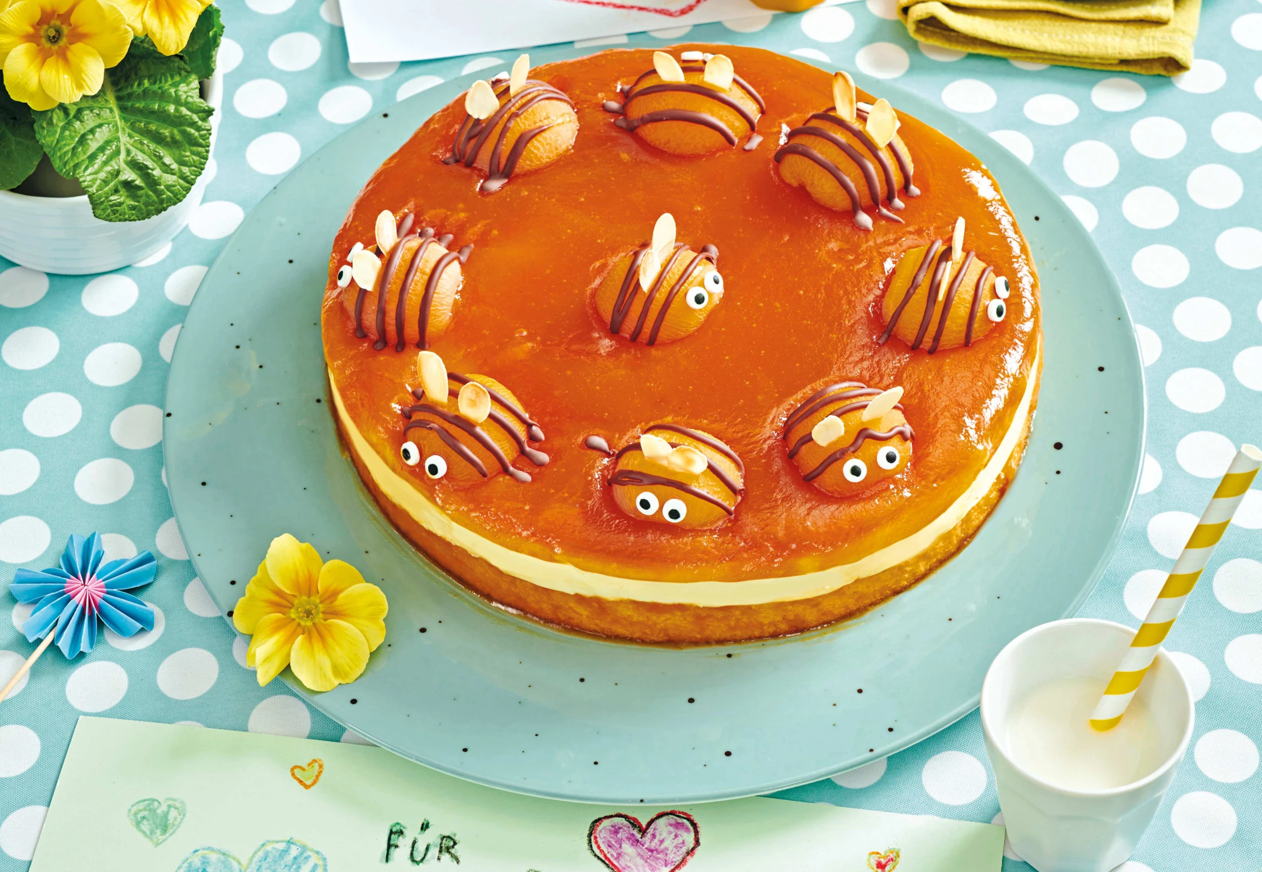 Torte aus der Form lösen, Backpapier abziehen und mit den Bienchen verzieren.