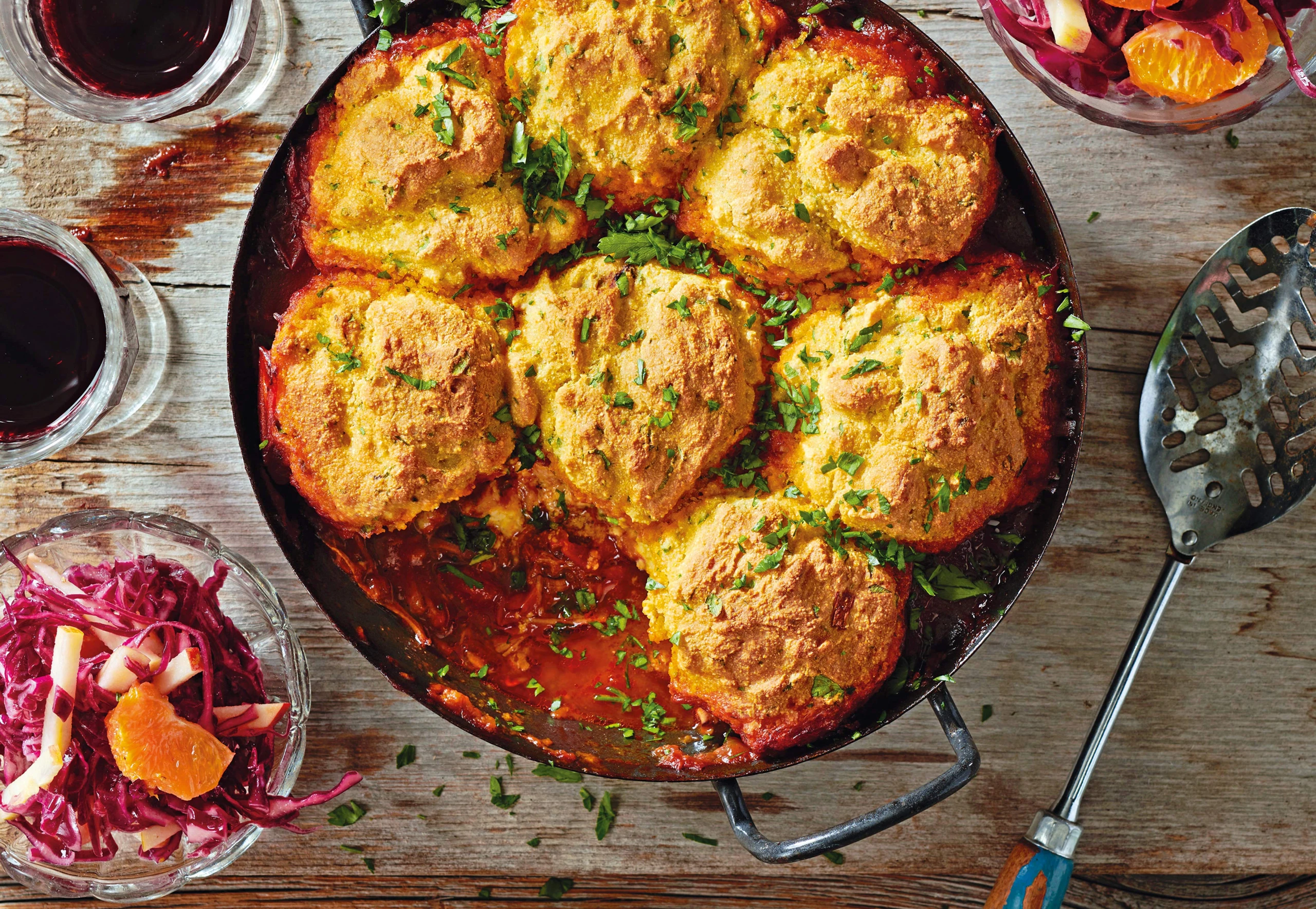Rohr auf 200°C vorheizen. Ein ofenfestes Reindl oder eine Auflaufform auf ein Blech stellen. Ragout einfüllen. Nocken vom Topping darauf verteilen. Im Rohr (zweite Schiene von unten) ca. 20 Minuten backen, bis die Oberfläche goldbraun ist. Herausnehmen und mit dem Rotkrautsalat servieren.