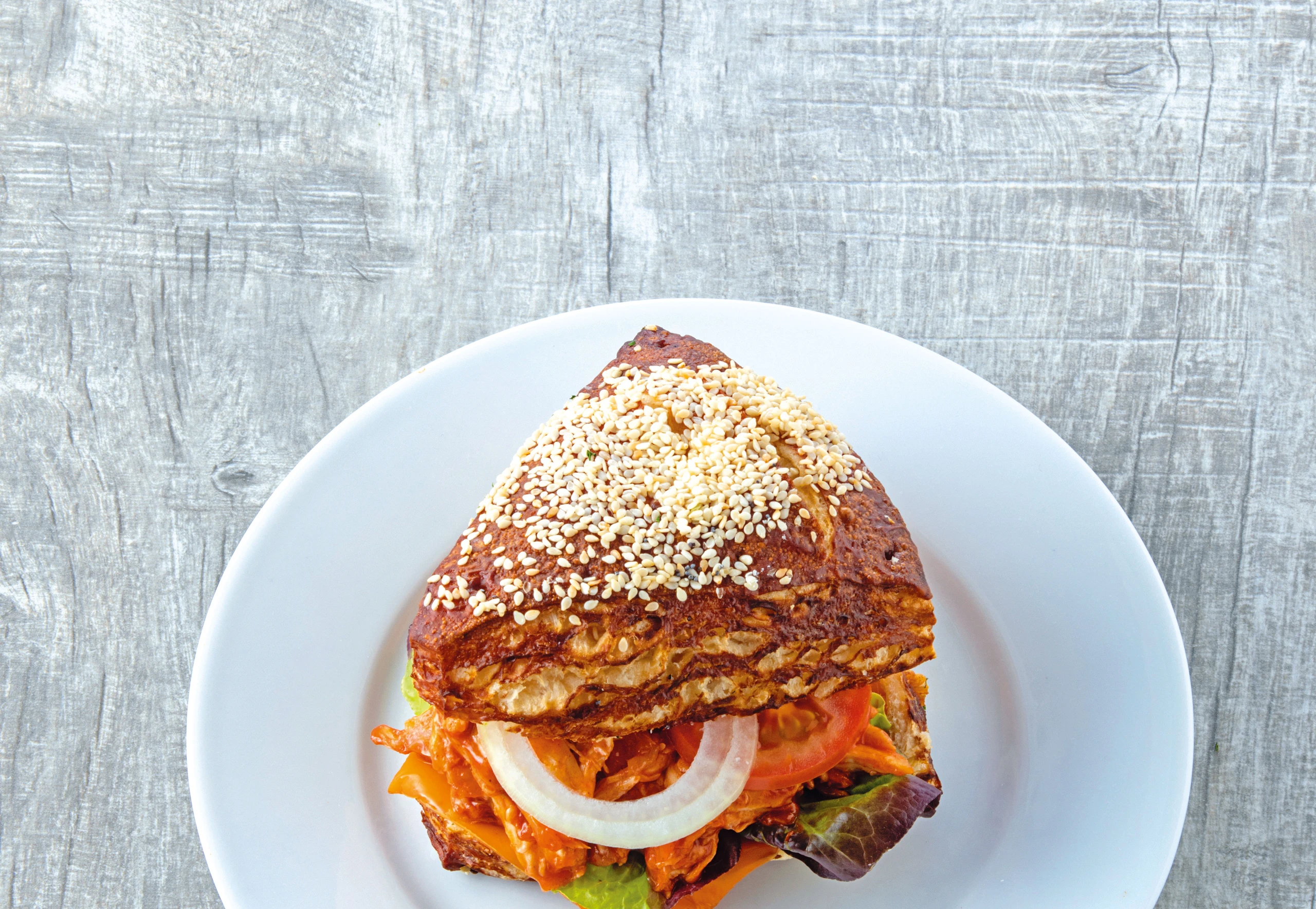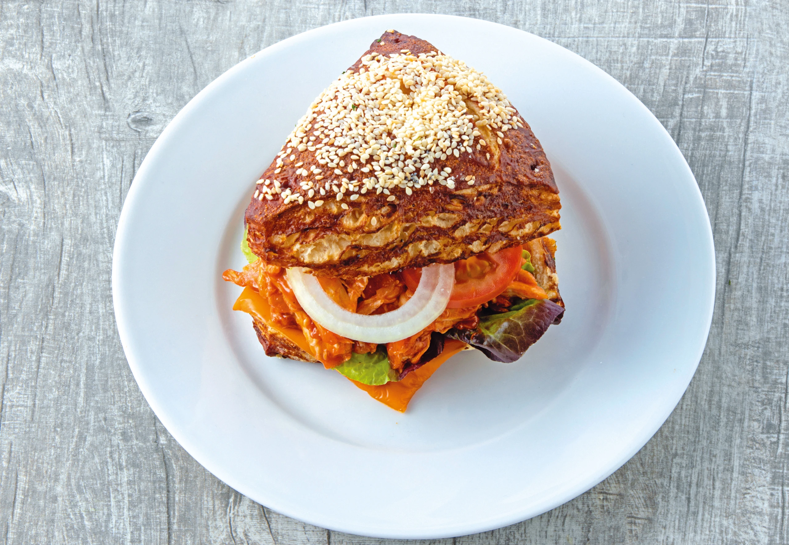 Weckerlböden mit Salatblättern belegen. Zwiebel schälen und in feine Ringe schneiden. Pulled Chicken auf den Weckerln verteilen. Mit Zwiebelringen und den oberen Weckerlhälften belegen.