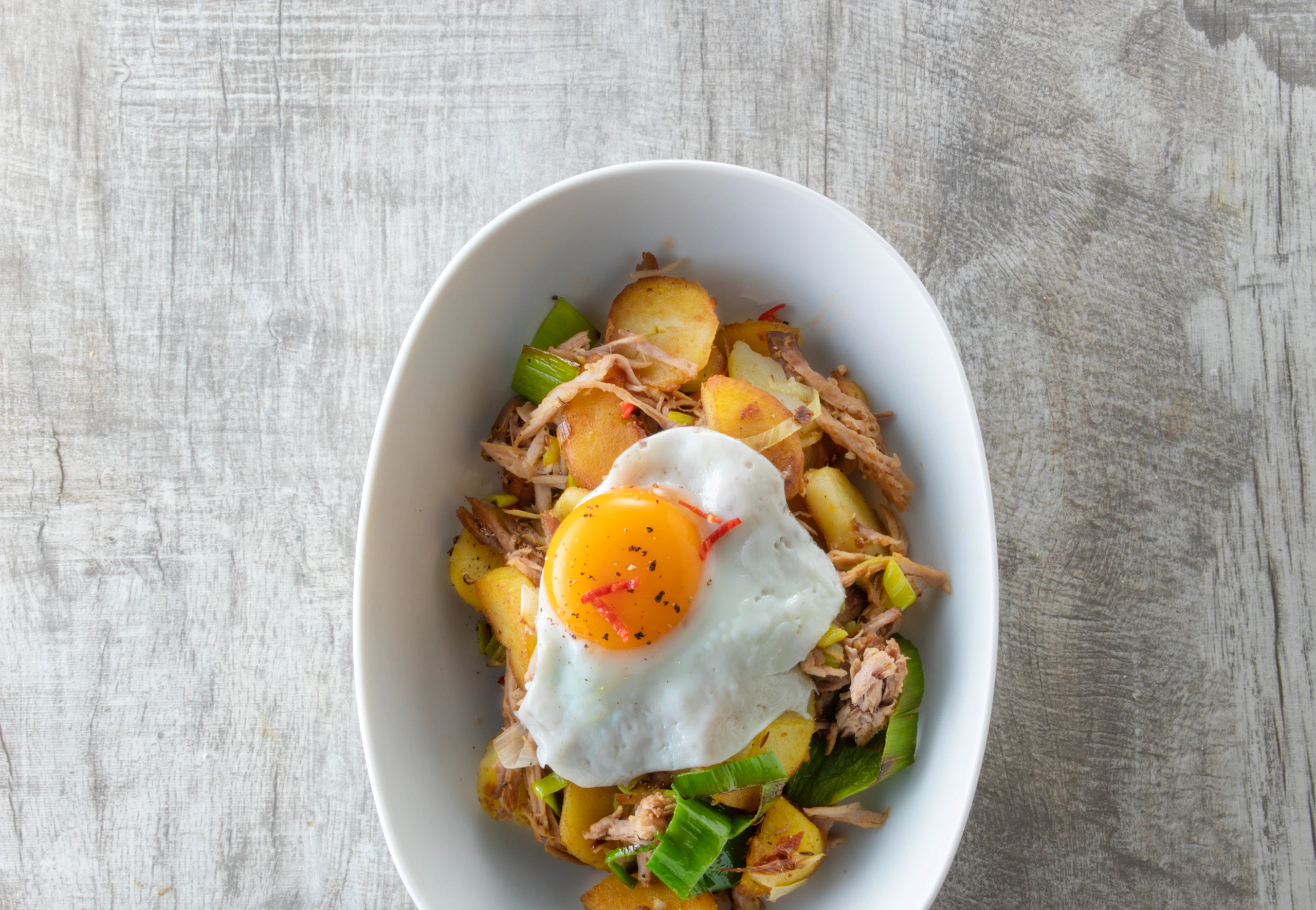 Erdäpfel in Salzwasser kochen, abseihen und schälen. Pulled Pork mit Bratensaft vermischen und ziehen lassen. Lauch längs aufschneiden, waschen und quer in 1 cm breite Scheiben schneiden. Erdäpfel in 1 cm dicke Scheiben schneiden. Chili quer in Streifen schneiden.