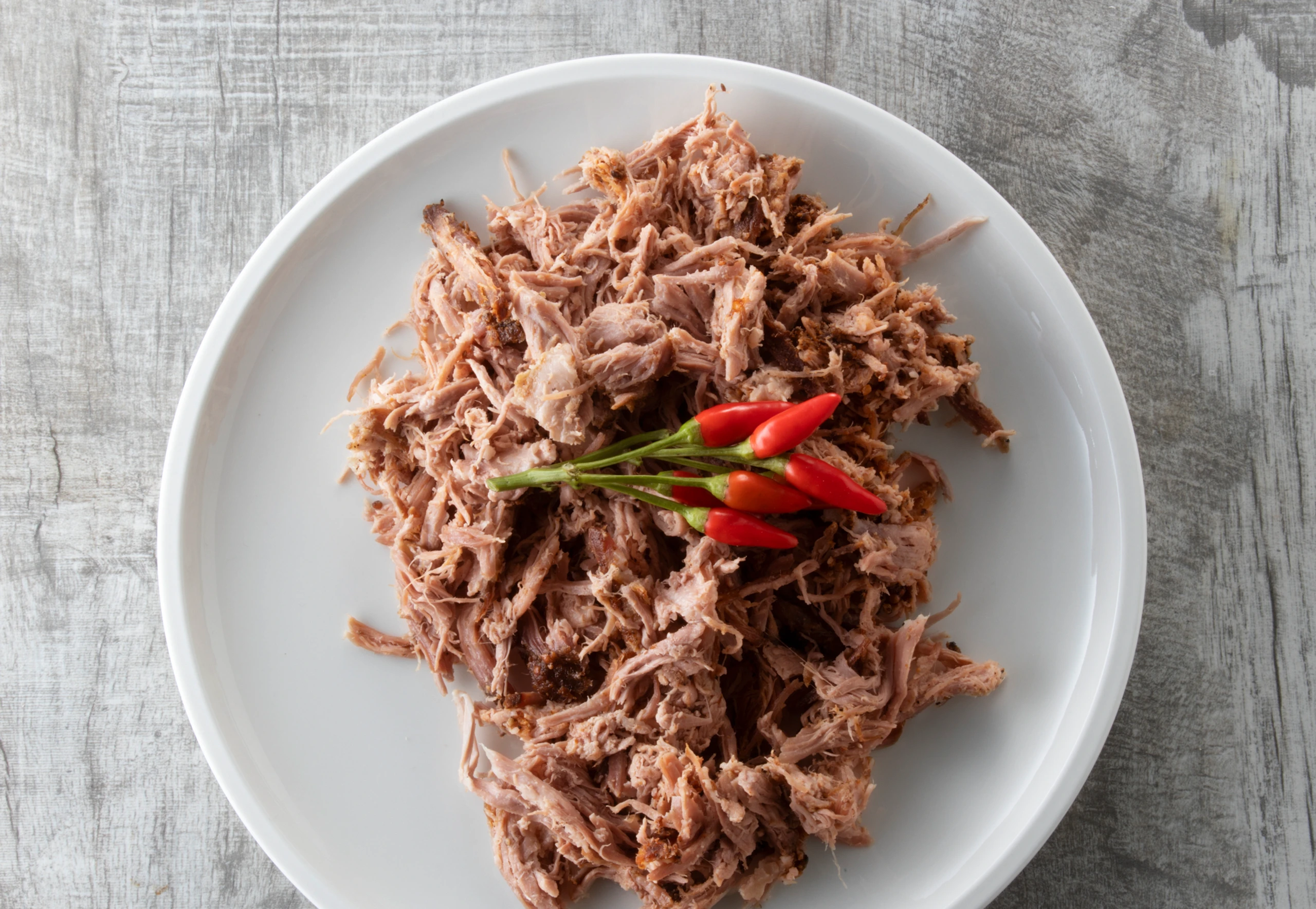 Fleisch herausnehmen, noch heiß mit zwei Gabeln in Fasern zupfen und mit Frischhaltefolie zudecken.