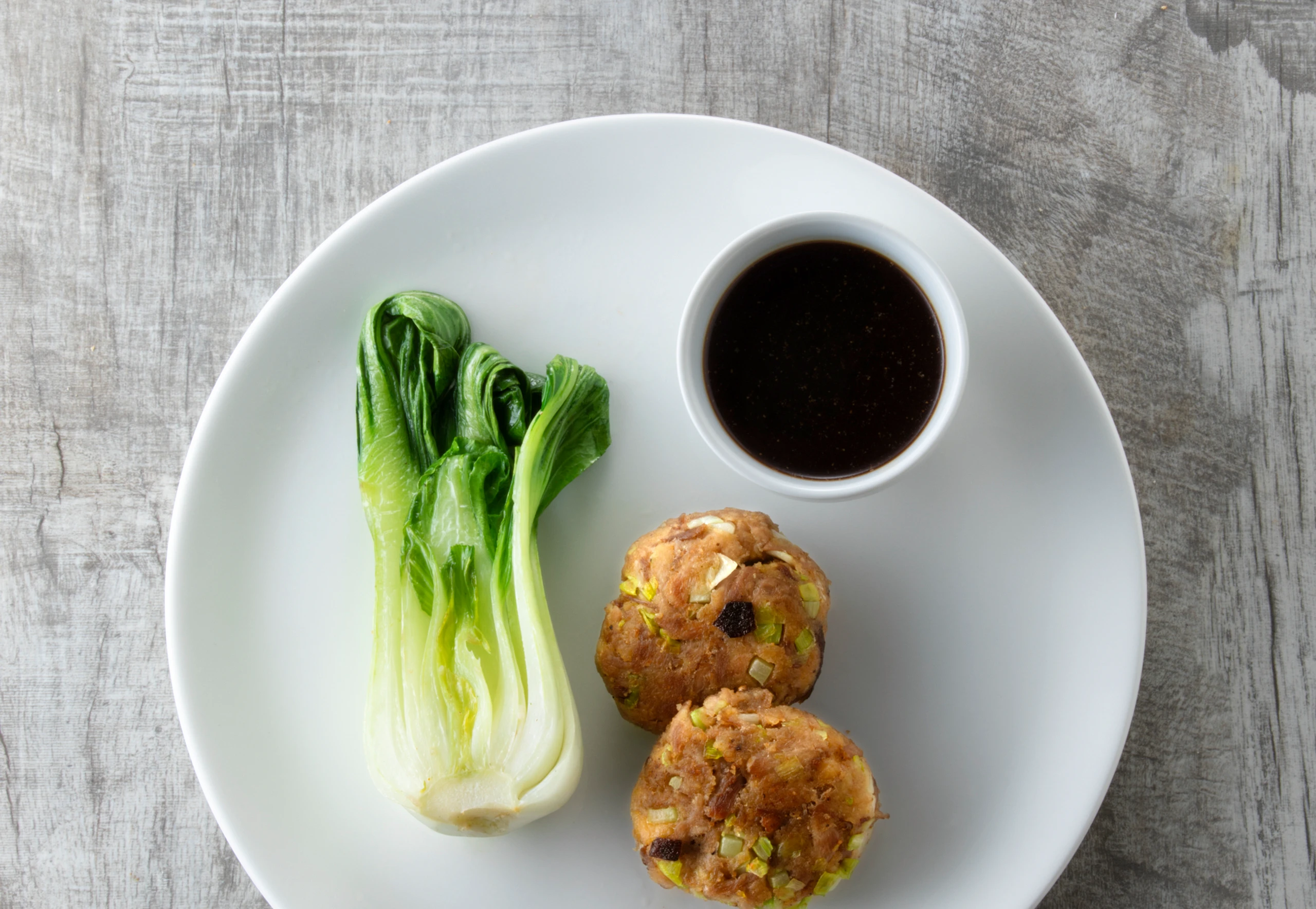 In einer zweiten Pfanne 1 Finger hoch Öl erhitzen, die Laibchen darin beidseitig braten, dabei immer wieder mit Bratfett übergießen. Aus der Pfanne nehmen und mit Küchenpapier trockentupfen. Übrigen Bratensaft erhitzen. Laibchen mit Pak Choi und Bratensaft anrichten.