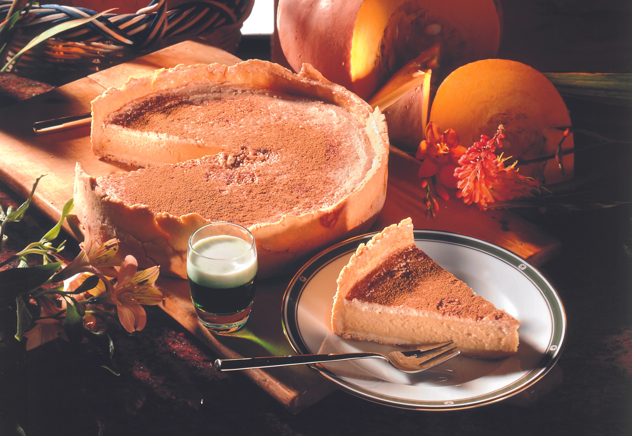 Für die Fülle Frischkäse mit Zucker, je 1 TL Vanilleextrakt, gemahlenem Zimt und geriebener Muskatnuß sowie je 1/2 TL Salz und gemahlenem Ingwer verrühren. Obers mit den Eiern verschlagen. Zuerst das Kürbispüree, dann die Eimischung unter die Käsemasse rühren. Backrohr auf 160 °C vorheizen.