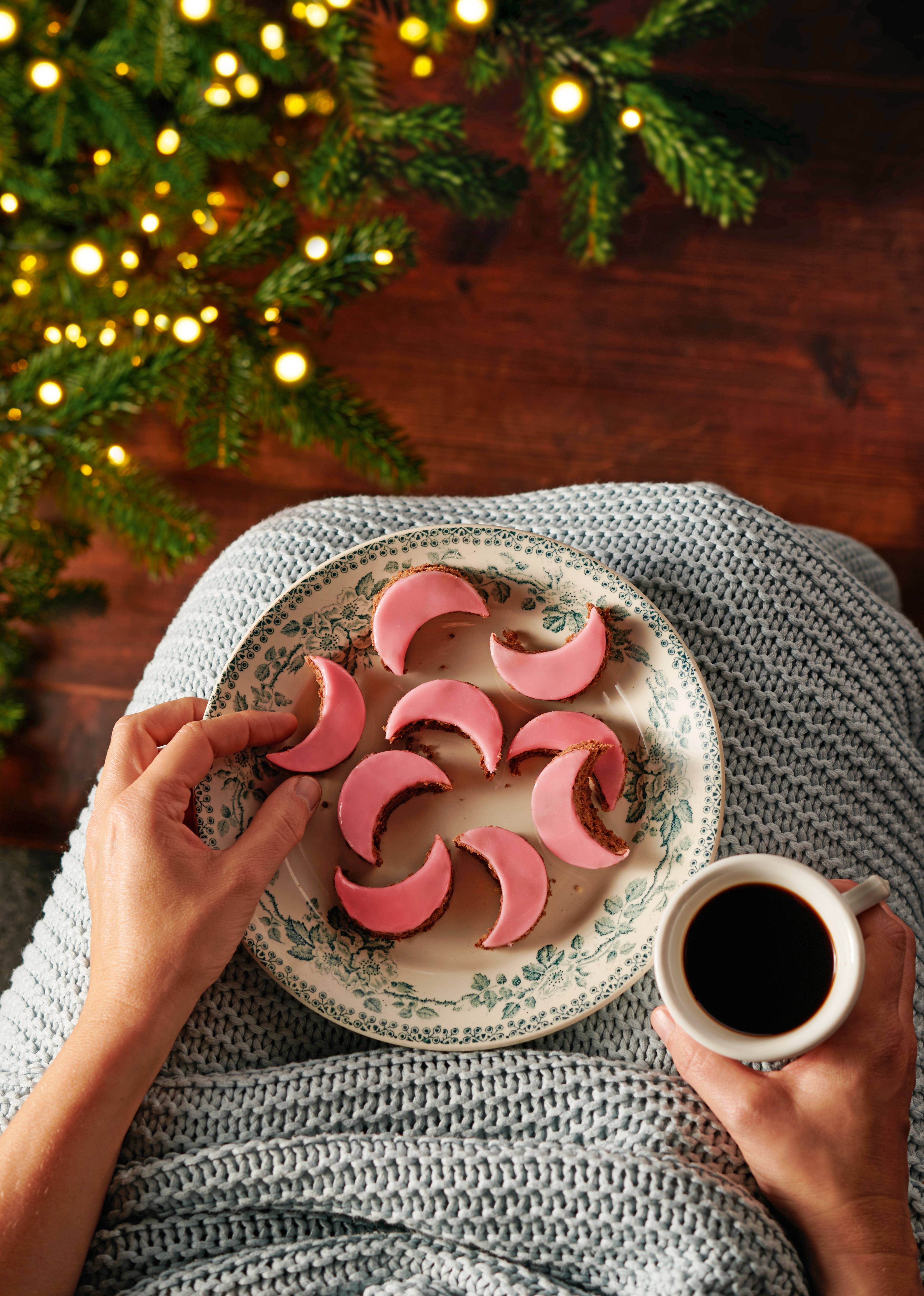 - Punschglasur in einem Wasserbad (oder der Mikrowelle) schmelzen. Teig dünn mit der Glasur bestreichen und 10–15 Minuten trocknen lassen. Mit einem runden Ausstecher (Ø ca. 5 cm) Monde abstechen. Dafür nur mit der Hälfte des Ausstechers den Teig mondförmig ausstechen (siehe Video).