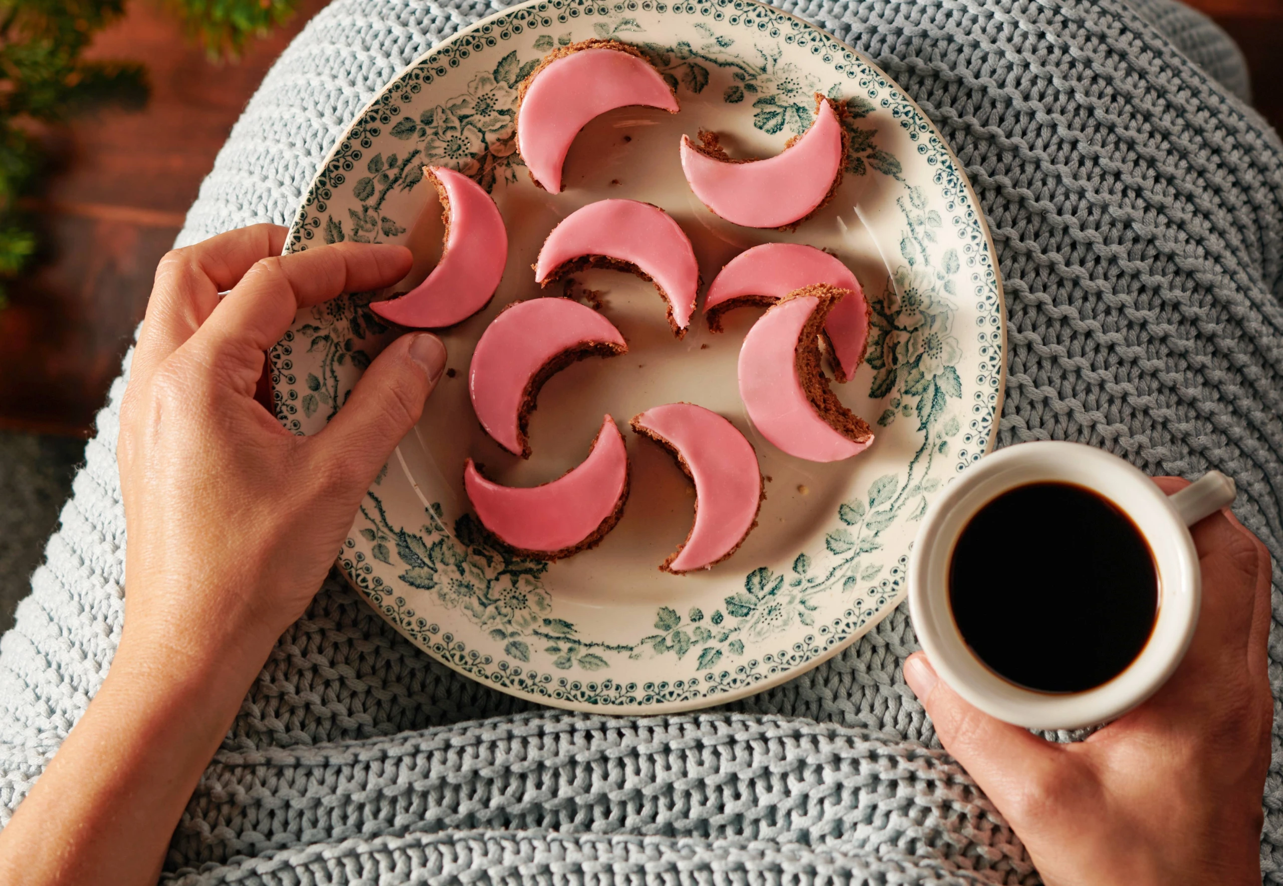 Punschglasur in einem Wasserbad (oder der Mikrowelle) schmelzen. Teig dünn mit der Glasur bestreichen und 10–15 Minuten trocknen lassen. Mit einem runden Ausstecher (Ø ca. 5 cm) Monde abstechen. Dafür nur mit der Hälfte des Ausstechers den Teig mondförmig ausstechen (siehe Video).