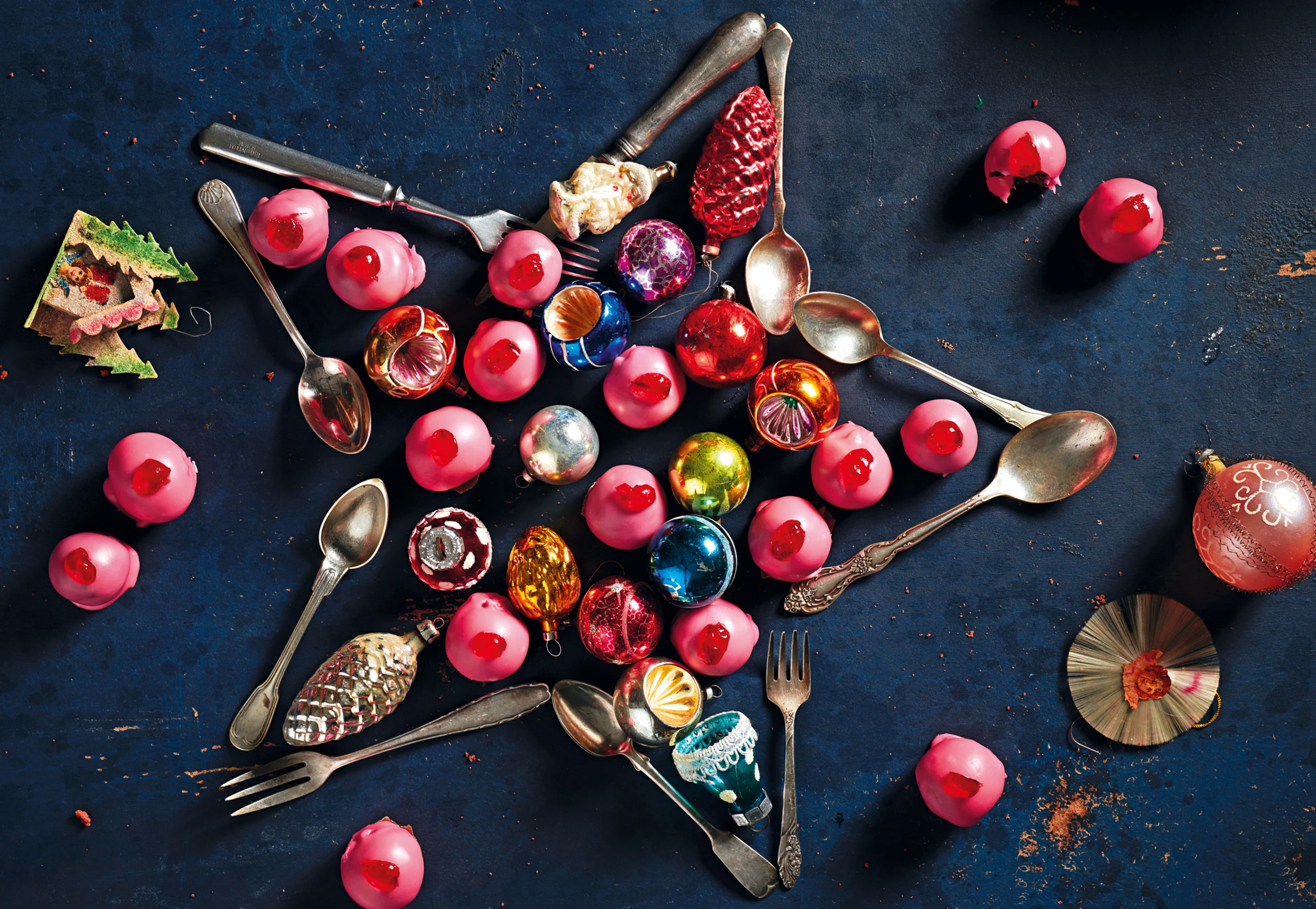 Glasur in einem Wasserbad schmelzen. Kugeln mit einem Zahnstocher aufspießen, in die Glasur tunken und gut abtropfen lassen. Auf Backpapier legen. Kirschen vierteln und jede Praline mit einem Stück belegen. Punsch-Pralinen trocknen lassen.