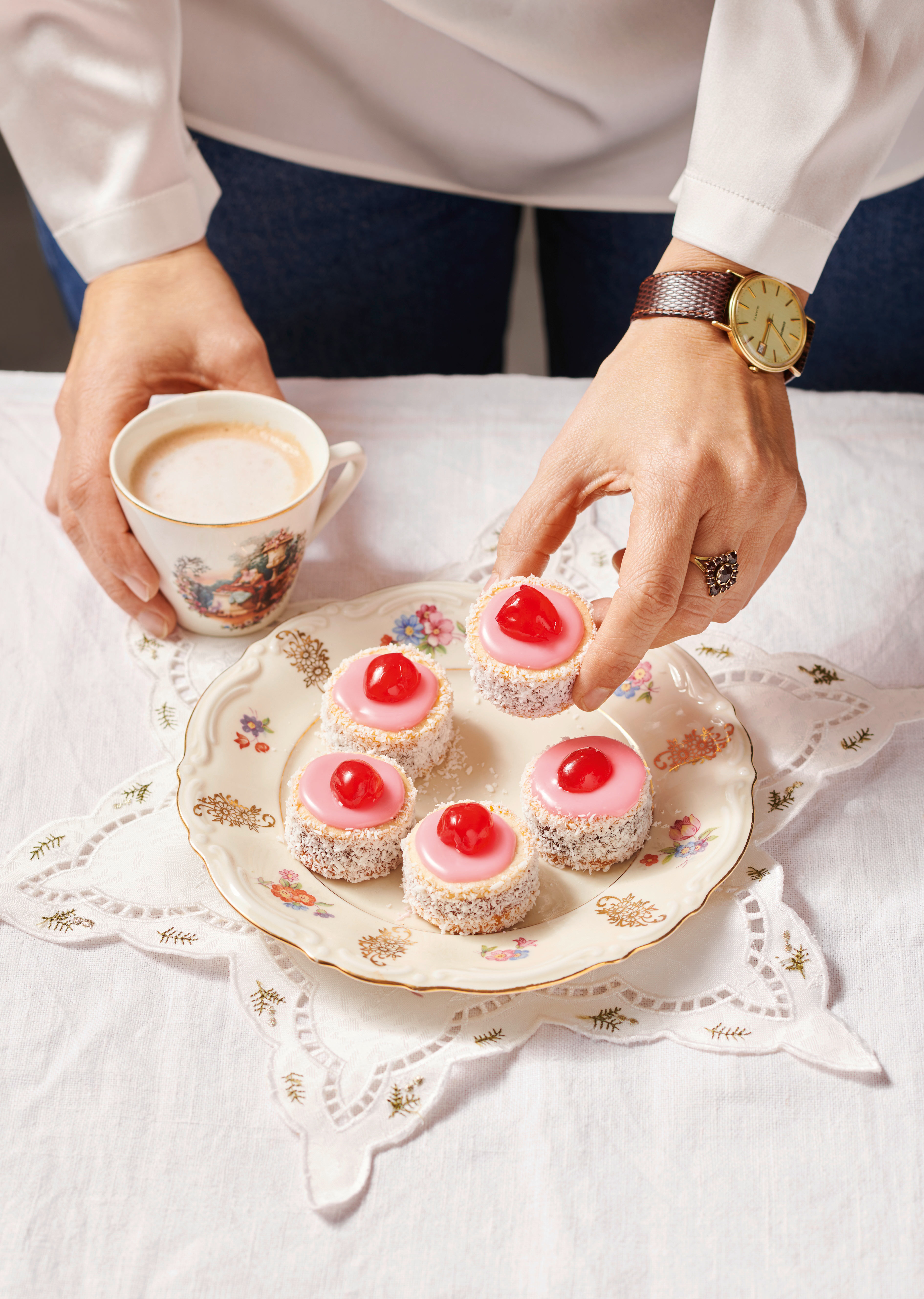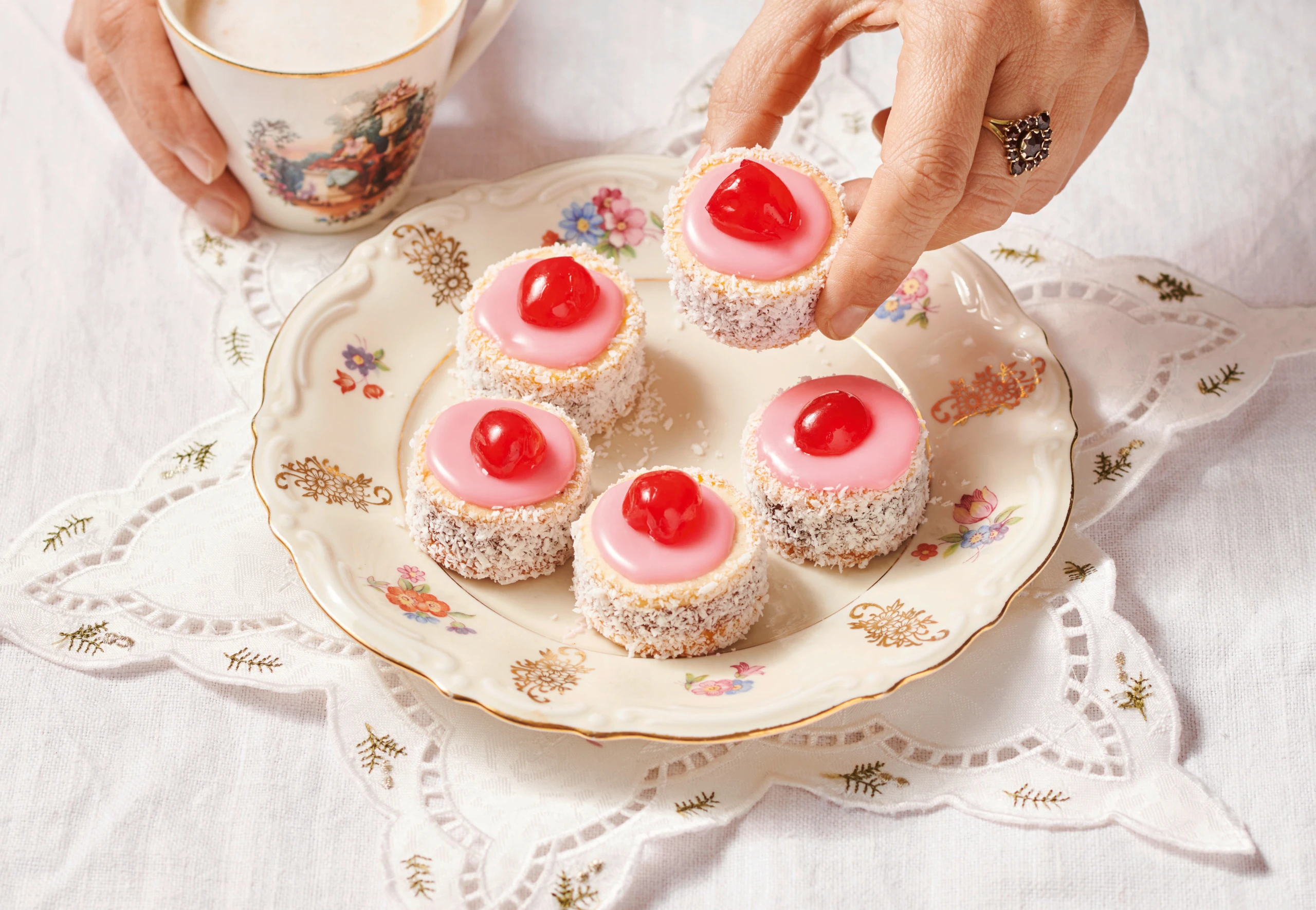 Für die Deko die Kirschen halbieren. Keksrand mit einem Pinsel rundum dünn mit Marmelade bestreichen und in Kokosette wälzen.