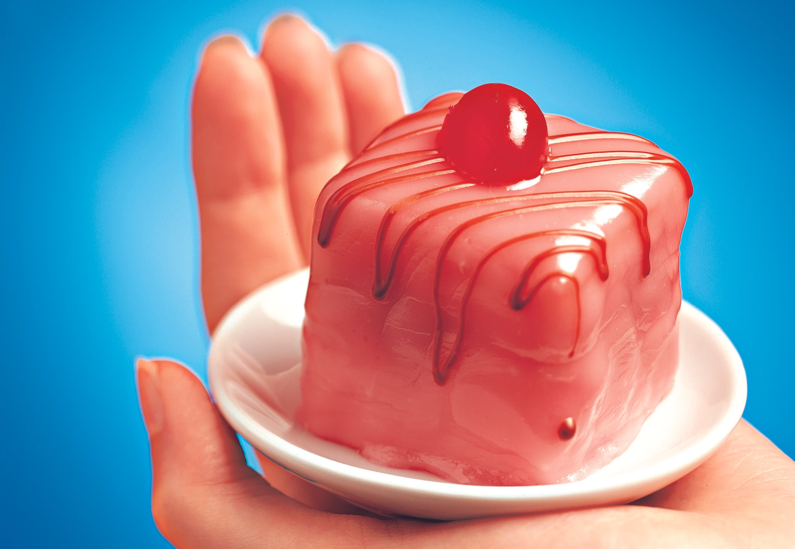 - Fondant mit Wasser und einigen Tropfen Lebensmittelfarbe erwärmen, maximal 50 °C, dabei wird die Masse flüssig. Glasur auf 35 °C (lippenwarm) abkühlen lassen.