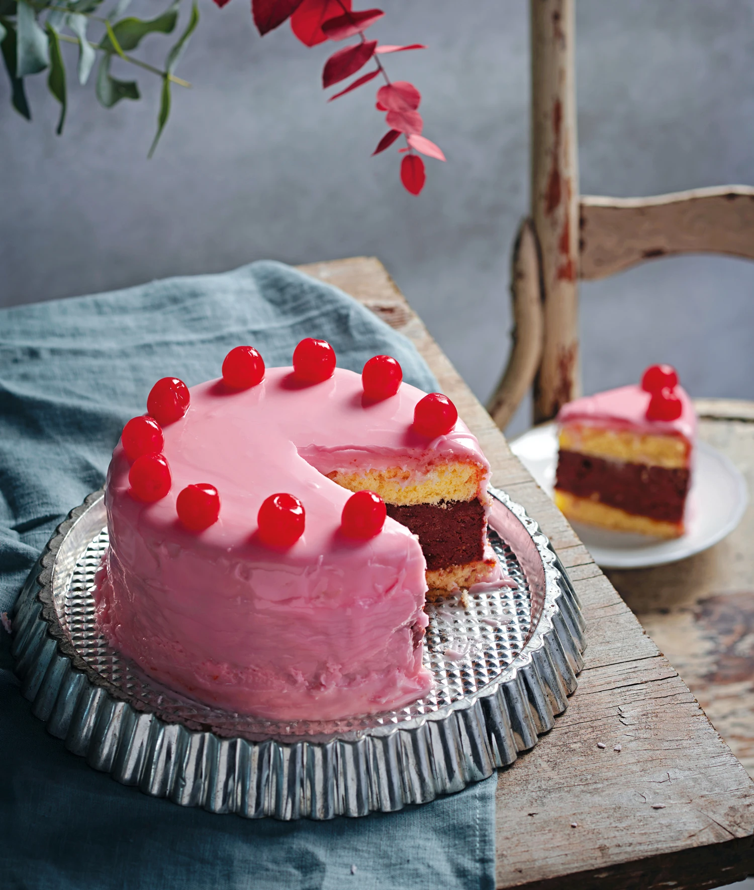 Torte auf ein Gitter stellen und mit der Fondantglasur überziehen. Glasur abtropfen lassen. Torte mit den Kirschen verzieren. Glasur trocknen lassen und die Torte servieren.