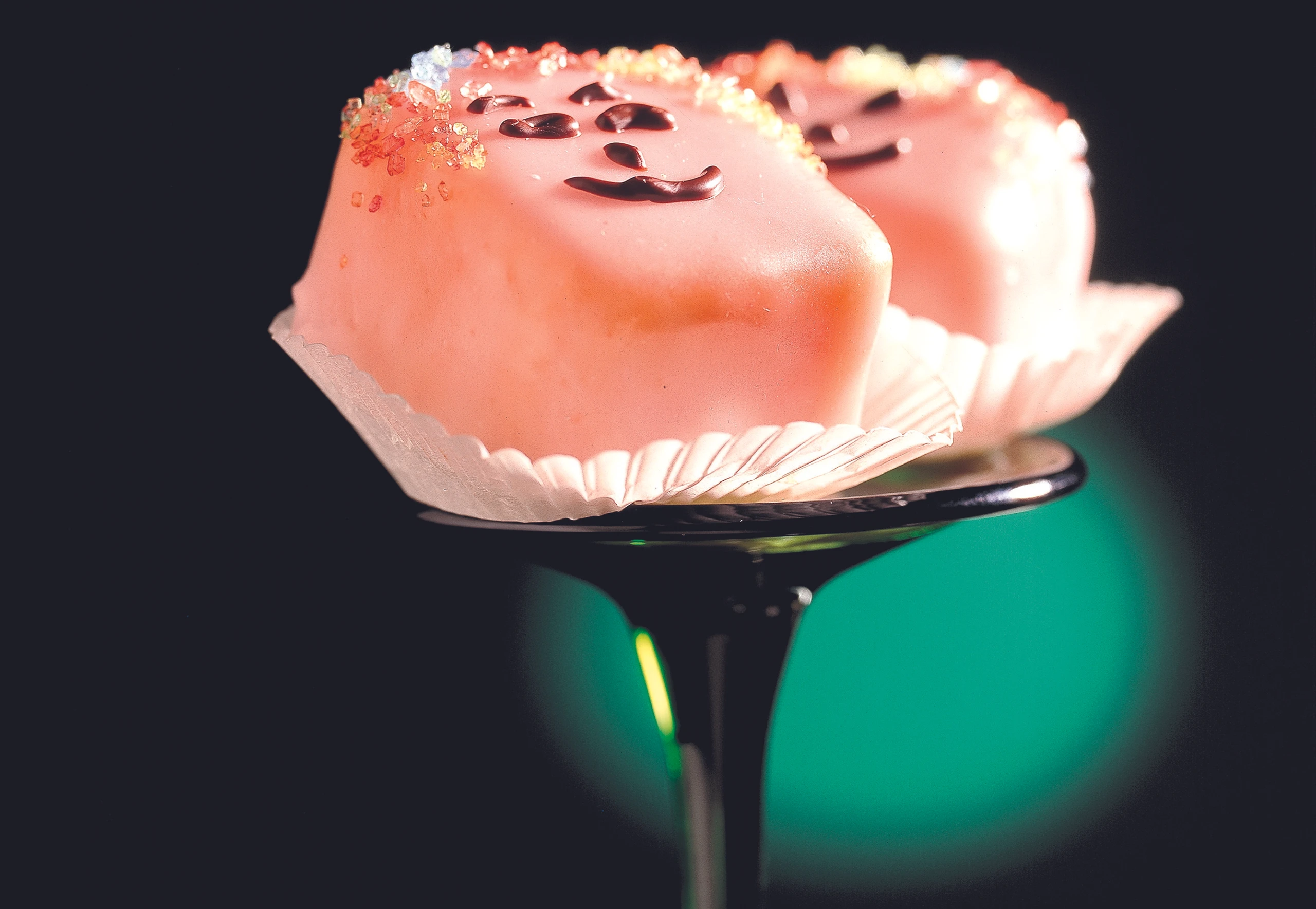 Für die Punschfülle die Biskuitabschnitte in Würfel schneiden bzw. Biskotten in Stücke brechen und mit Rum, Vanillezucker und Marmelade gut vermischen. Einen Biskuitfleck mit der Oberfläche nach unten auf ein Blech mit hohem Rand legen. Punschmasse darauf gleichmäßig verteilen, den zweiten Biskuitfleck darauf setzen und die Punschschnitte mit einem Brettchen beschwert in den Kühlschrank stellen. Marmelade erhitzen. Punschschnitte in Stücke schneiden und mit der Marmelade bestreichen. Fondant erwärmen, eventuell durch Zugabe von Kakao oder Fruchtsirup einfärben und die Biskuitstücke glasieren. Die Oberfläche trocknen lassen und mit geschmolzener Schokolade dekorieren.