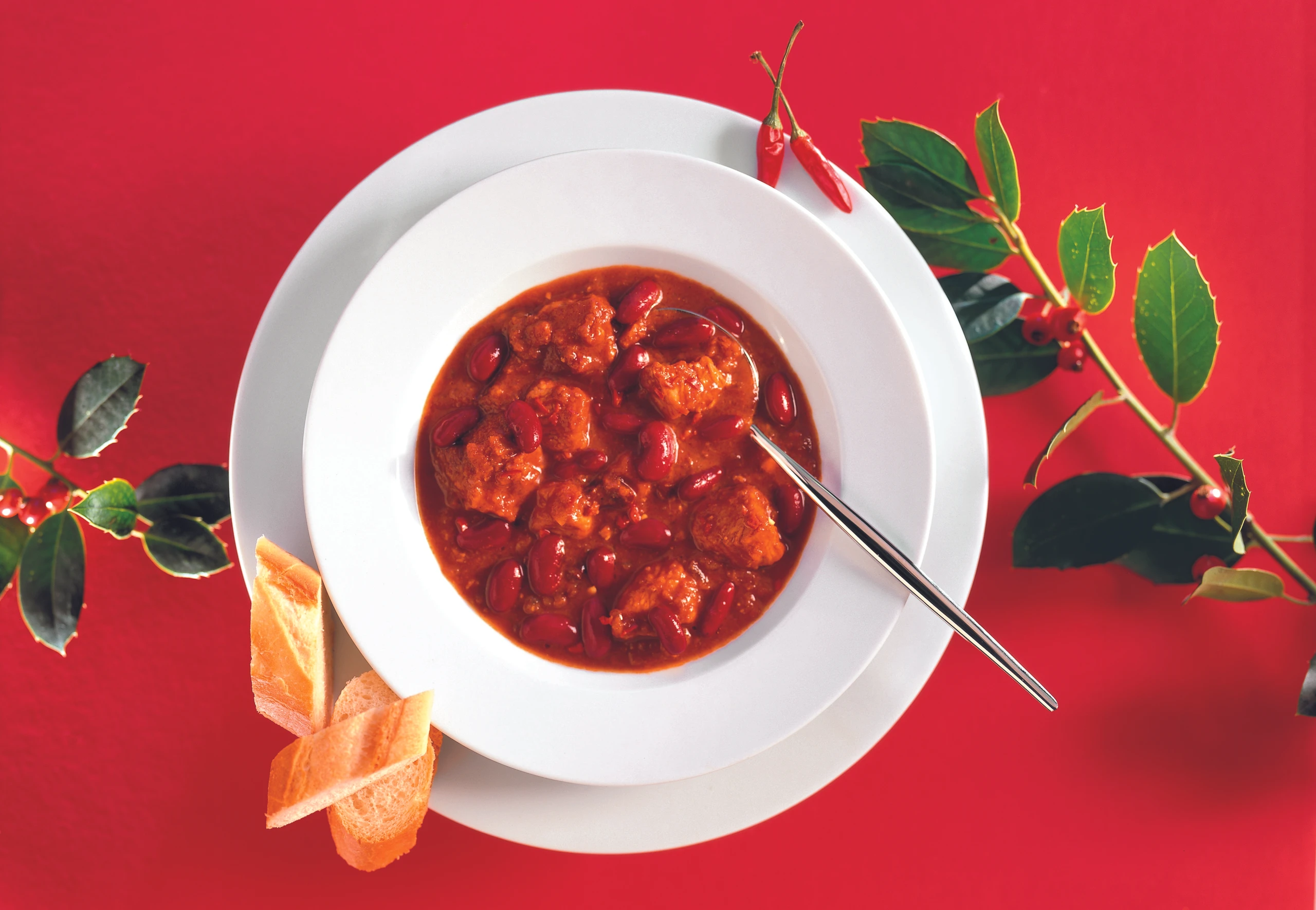Chilischote entkernen und klein würfelig schneiden. Bohnen kalt abspülen und abtropfen lassen. Bohnen und Chili in das Ragout rühren. Ragout erhitzen, mit Salz und Pfeffer abschmecken.