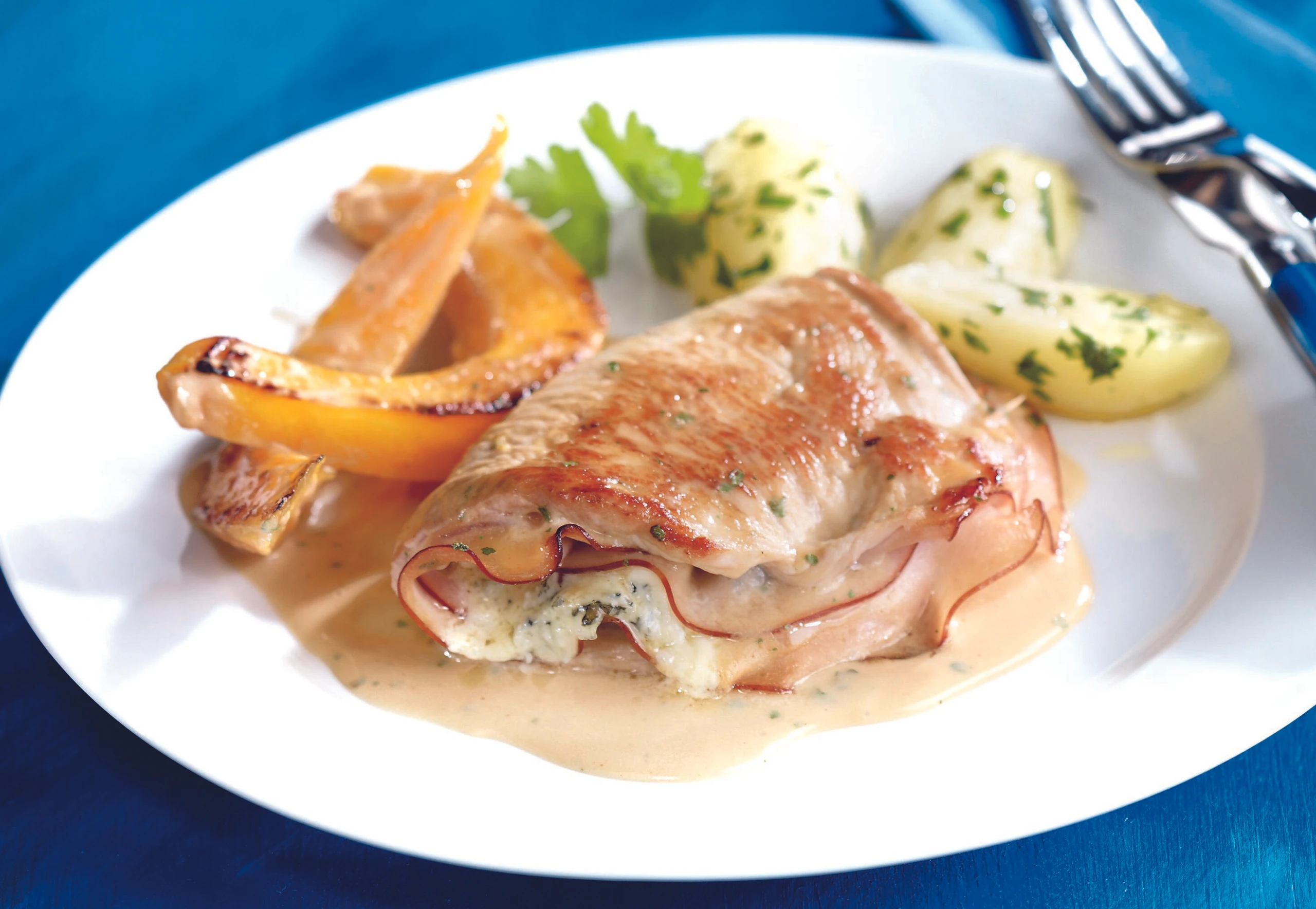 Käse in Stücke schneiden. Schnitzel leicht klopfen, pfeffern, mit Schinkenscheiben und Käse belegen. Schnitzel zusammenklappen, an den Rändern zusammendrücken und mit Zahnstochern fixieren. Kürbis in 2 cm breite Spalten schneiden.