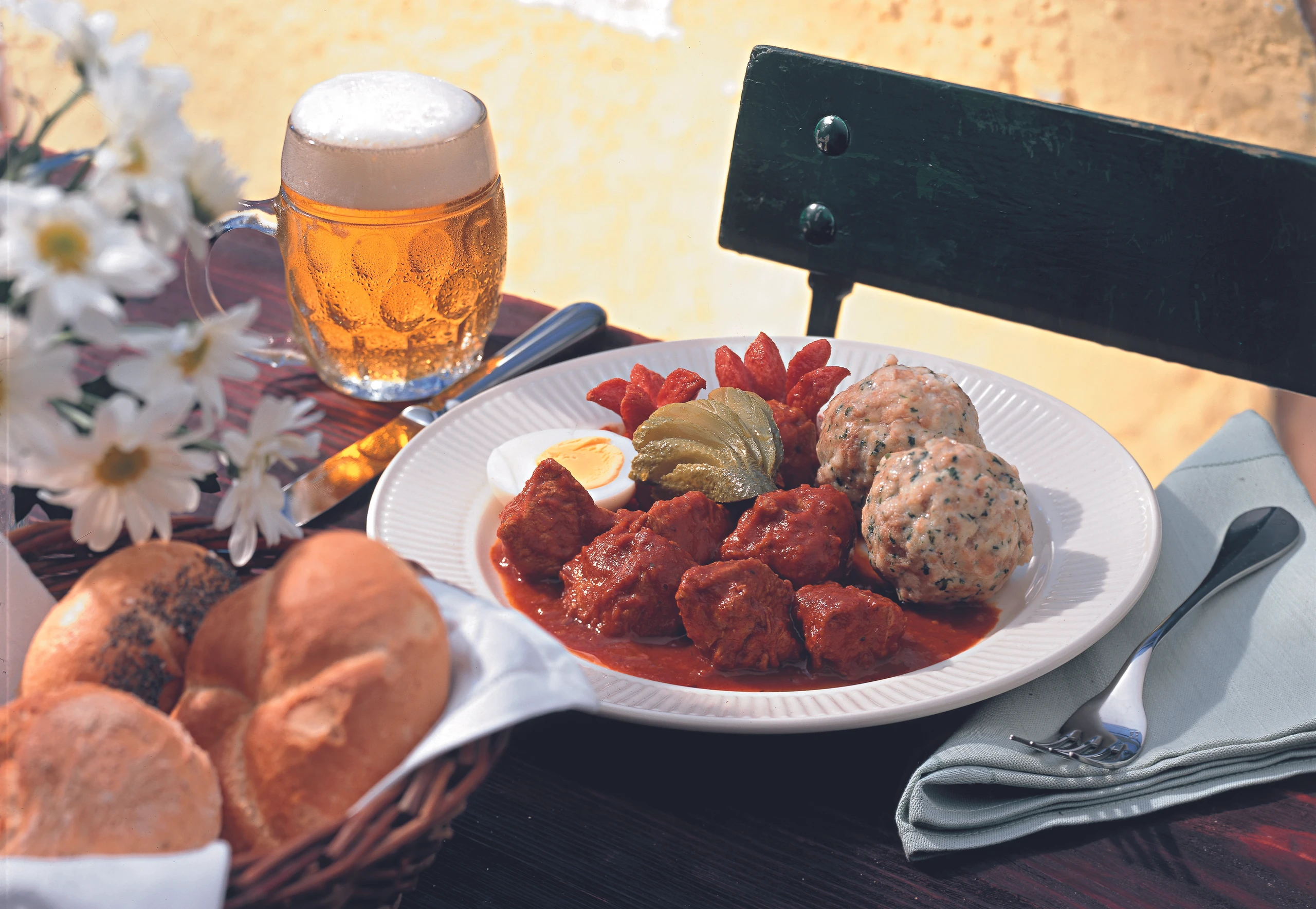 Würstel quer halbieren und die Enden kreuzweise einschneiden. Wurststücke in heißem Öl knusprig braten, aus dem Fett heben und gut abtropfen lassen. Gurkerln schräg halbieren und in Fächer schneiden. Eier schälen und halbieren. Gulasch auf Tellern anrichten und mit Eihälften, Gurkerlfächern und Würsteln garnieren.