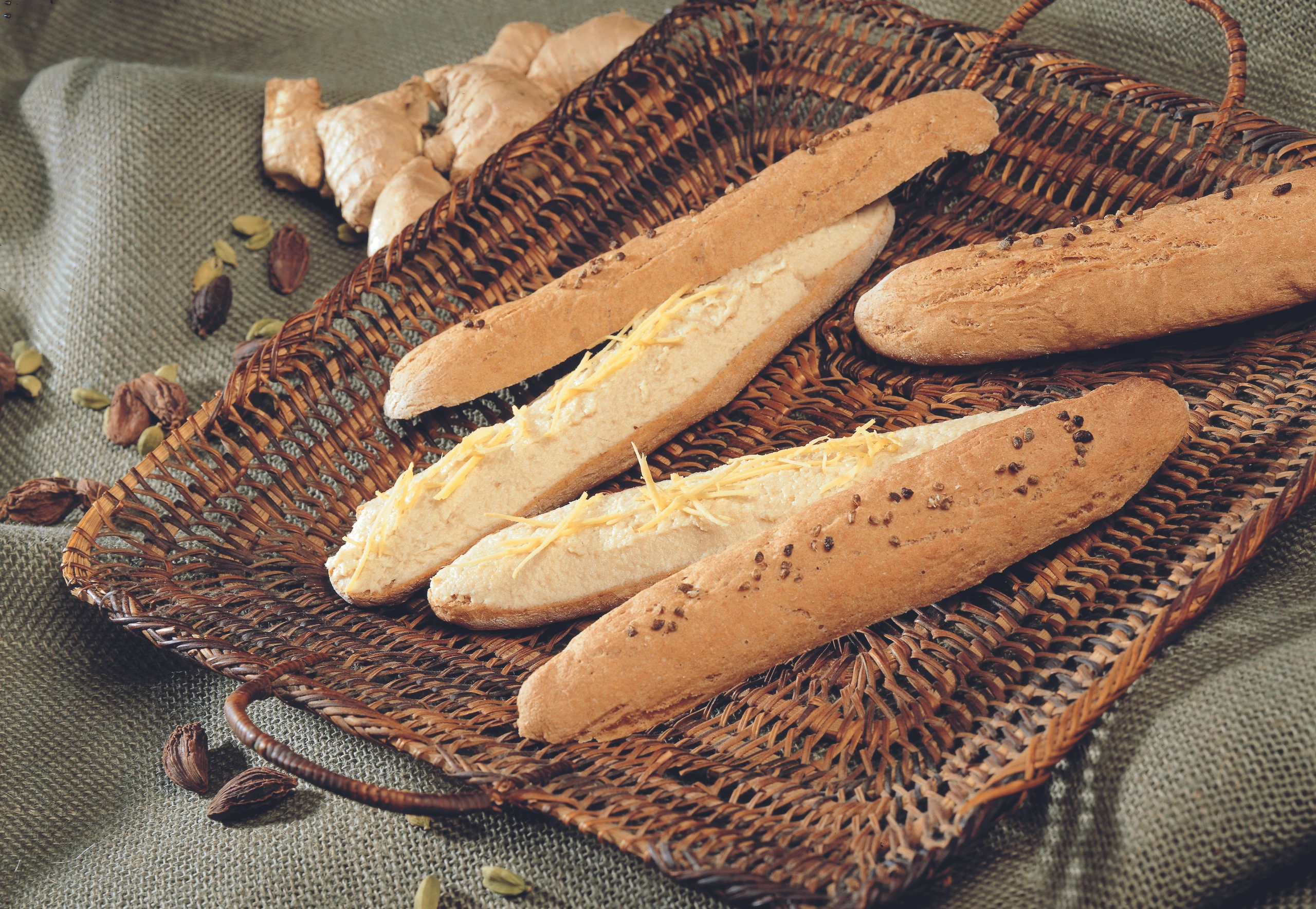 Den übrigen Ingwer in feine Streifen schneiden. Vollkorn-Stangerln (Rezept oben) der Länge nach halbieren, mit Puten-Ingwer-Aufstrich bestreichen und mit Ingwerstreifen bestreuen.