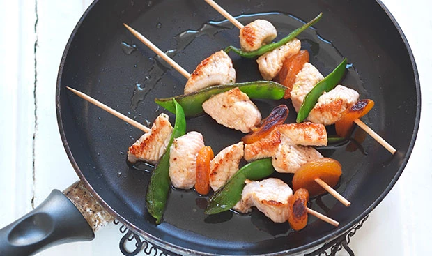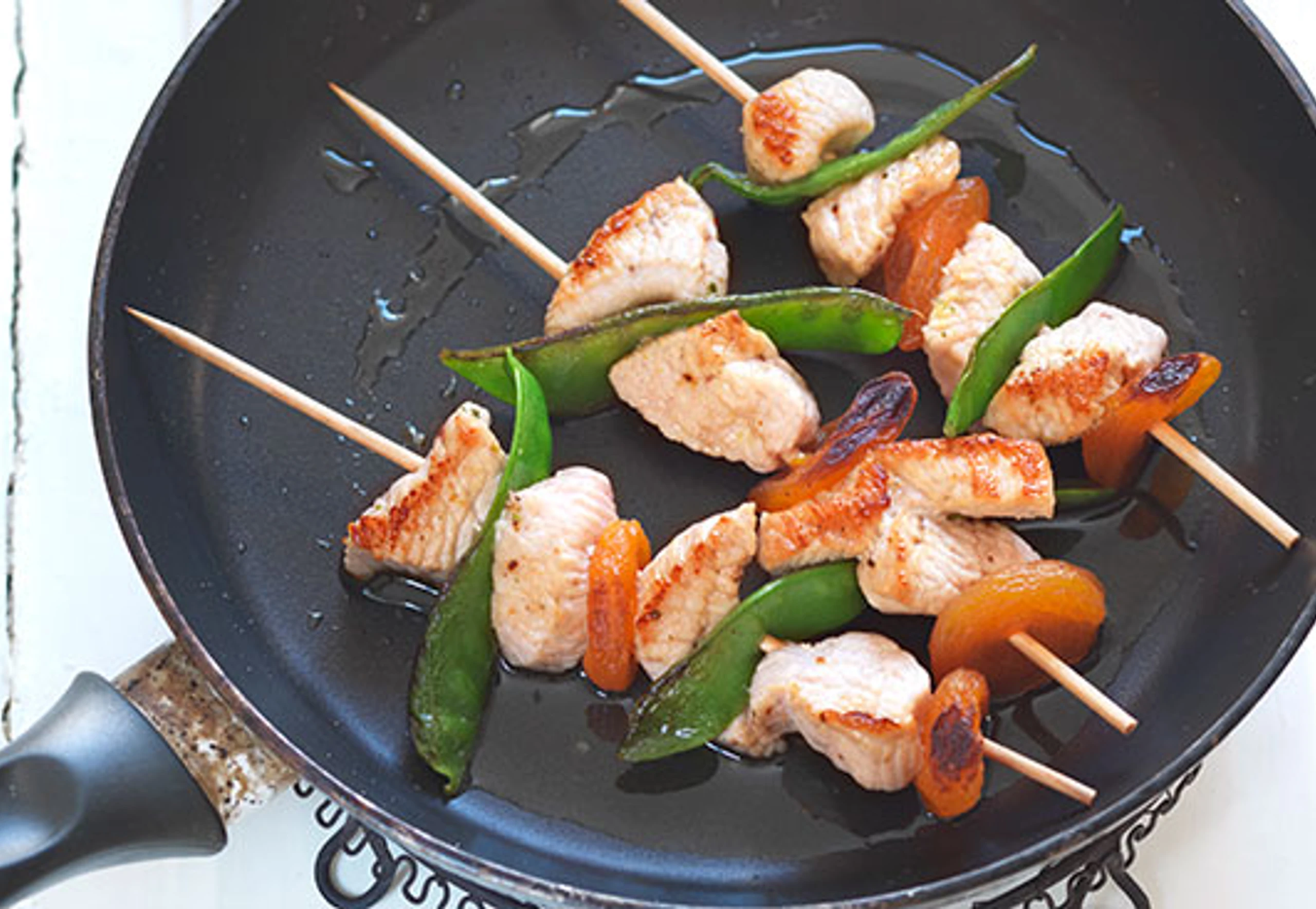 Fleisch in 3 cm große Stücke schneiden. Erbsenschoten putzen. Marillen, Fleisch und Schoten abwechselnd auf 4 Holzspießchen stecken. Spießchen in 3 EL Öl bei mittlerer Hitze rundum braten, herausnehmen und im Rohr warm stellen.