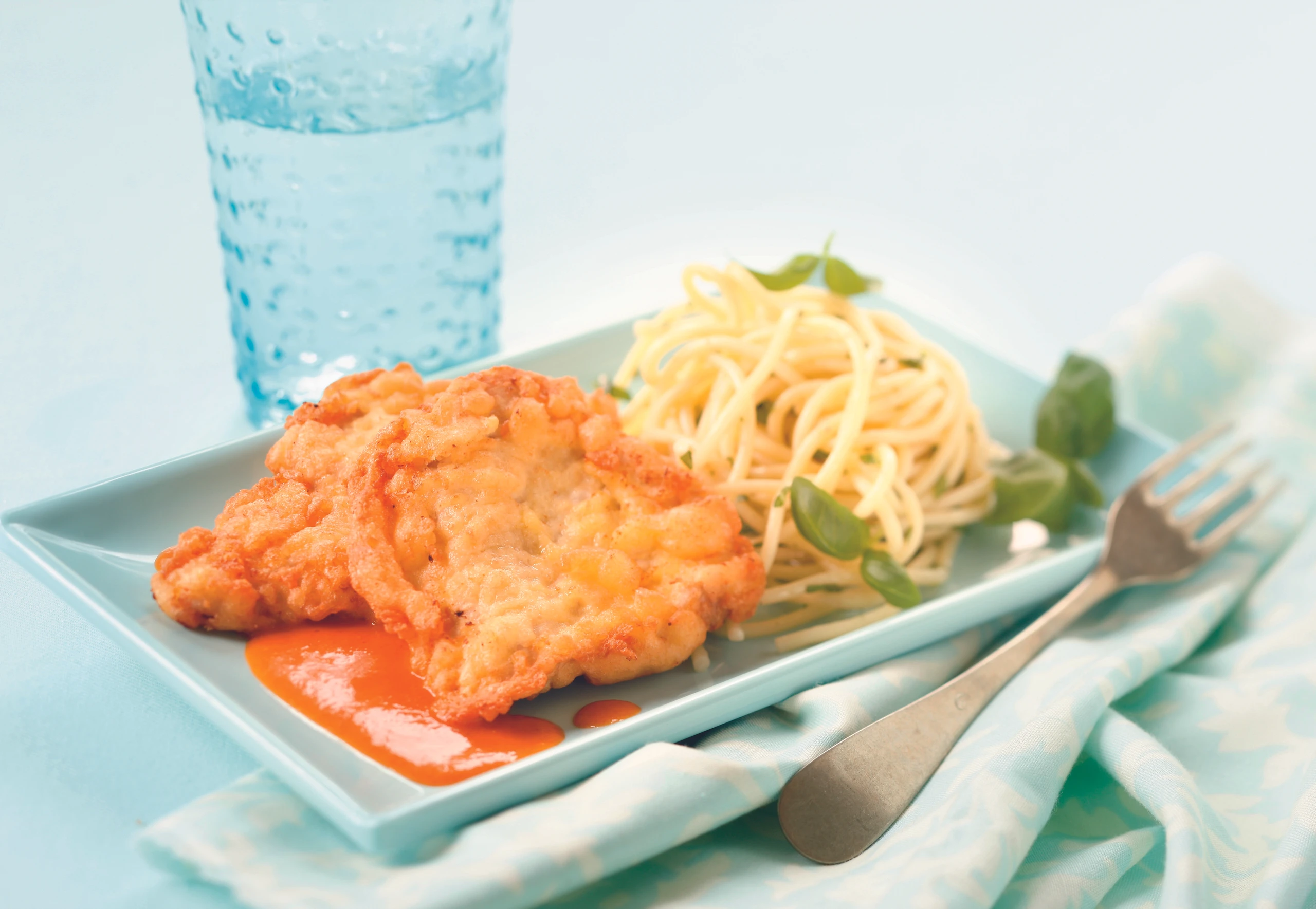 Basilikum in aufgeschäumter Butter anschwitzen und mit den Spaghetti vermischen. Piccata mit Spaghetti und Sauce anrichten.