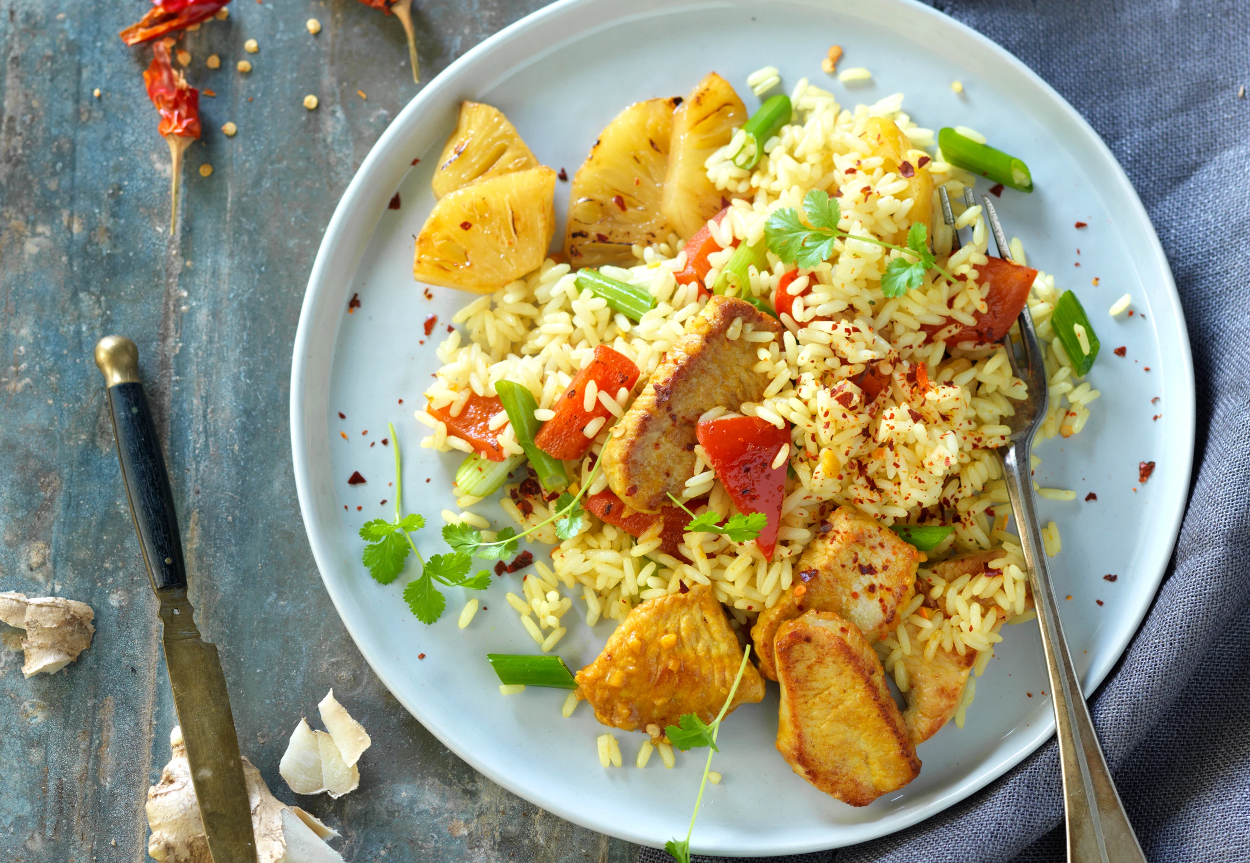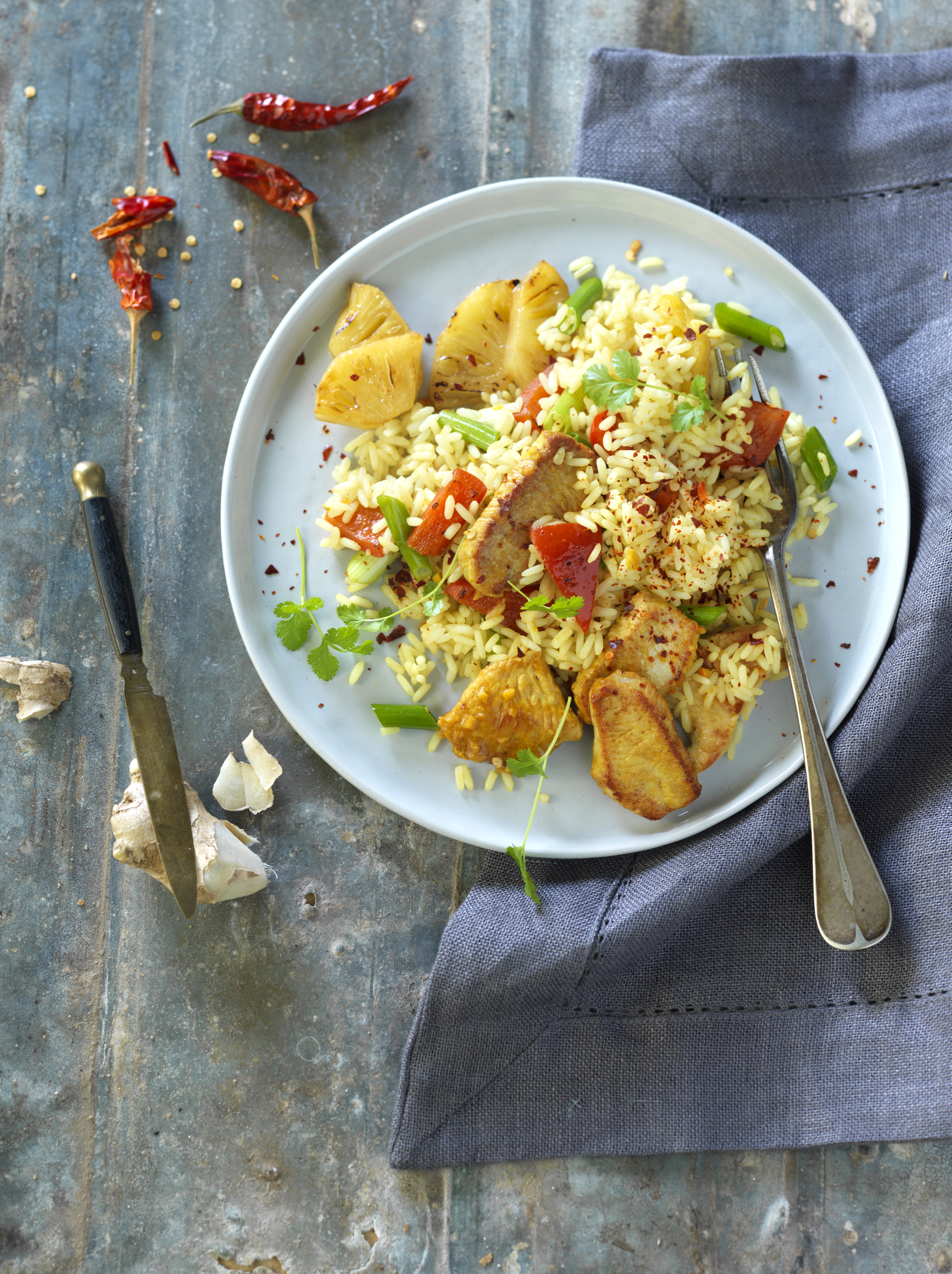 Reis in Salzwasser bissfest kochen (ca. 12 Minuten), abseihen und abtropfen lassen. Paprika in ca. 2 cm große Stücke, Jungzwiebel quer in Scheiben schneiden. Fleisch in Längsstreifen schneiden. Ananas schälen und den Strunk ausschneiden. Fleisch und Ananas quer in 1 cm dicke Scheiben schneiden.