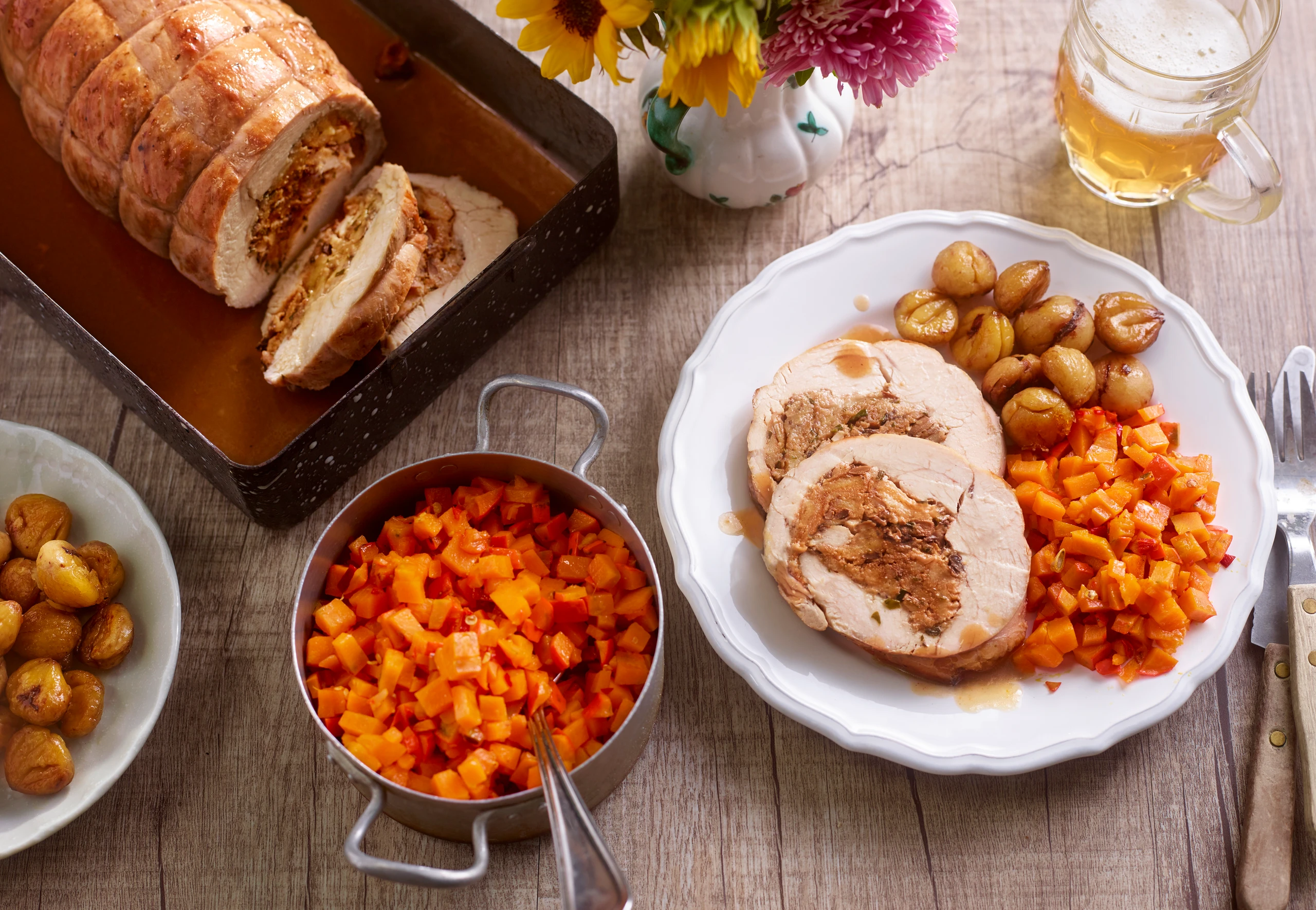 Fleisch längs bis knapp an das Ende einschneiden. Fleisch aufklappen, mit Frischhaltefolie belegen und behutsam ca. 2 cm dick, möglichst rechteckig klopfen. Fleisch beidseitig salzen und pfeffern. Fülle so auf dem Fleisch verteilen, dass an der oberen Längsseite ein 4 cm breiter Streifen frei bleibt. Fleisch über die Fülle straff einrollen und mit Spagat binden.