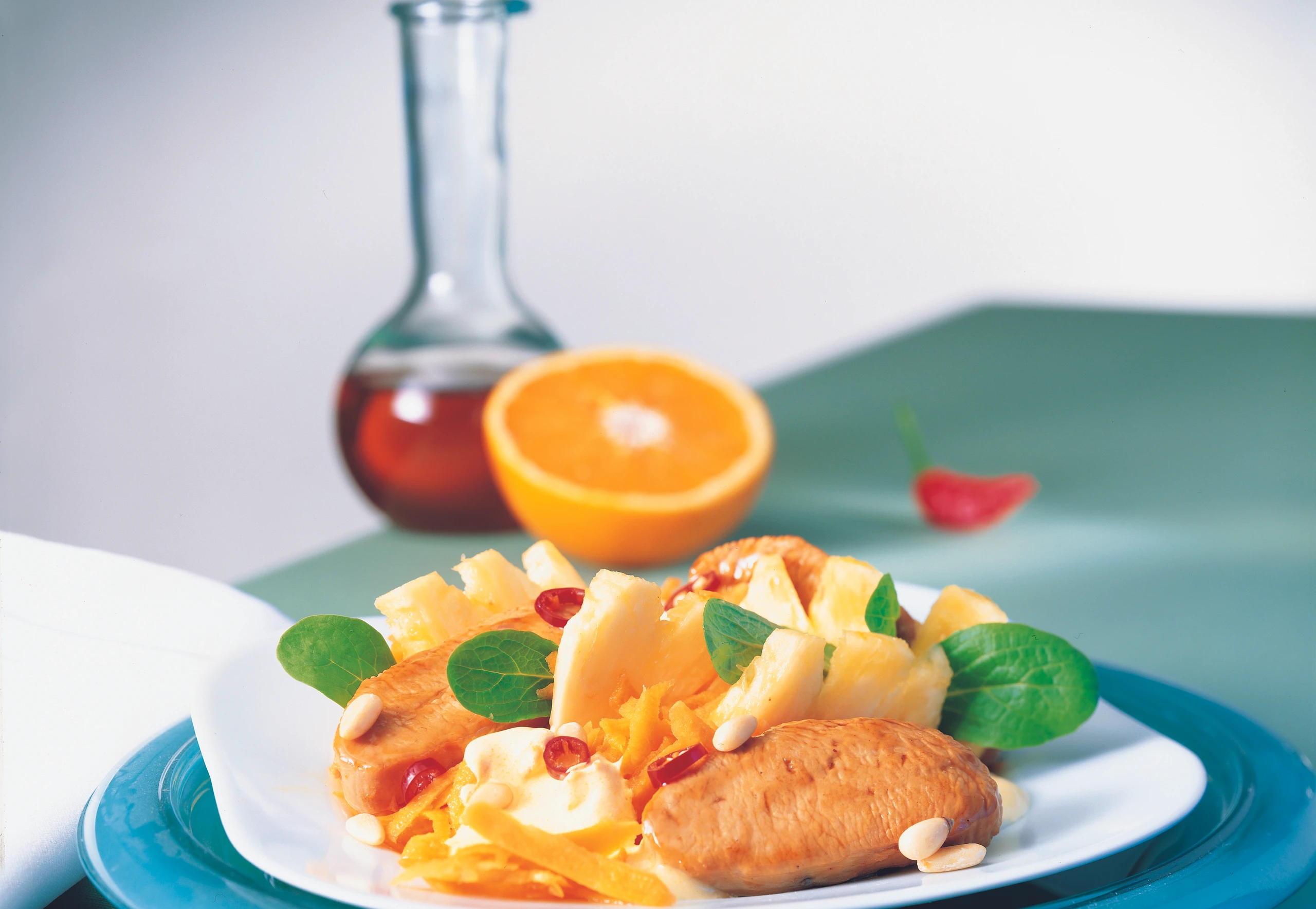 Karotten-Ananas-Salat mit Vogerlsalat anrichten. Fleisch darauf verteilen, Dressing darüber gießen und mit Pinienkernen bestreut servieren.