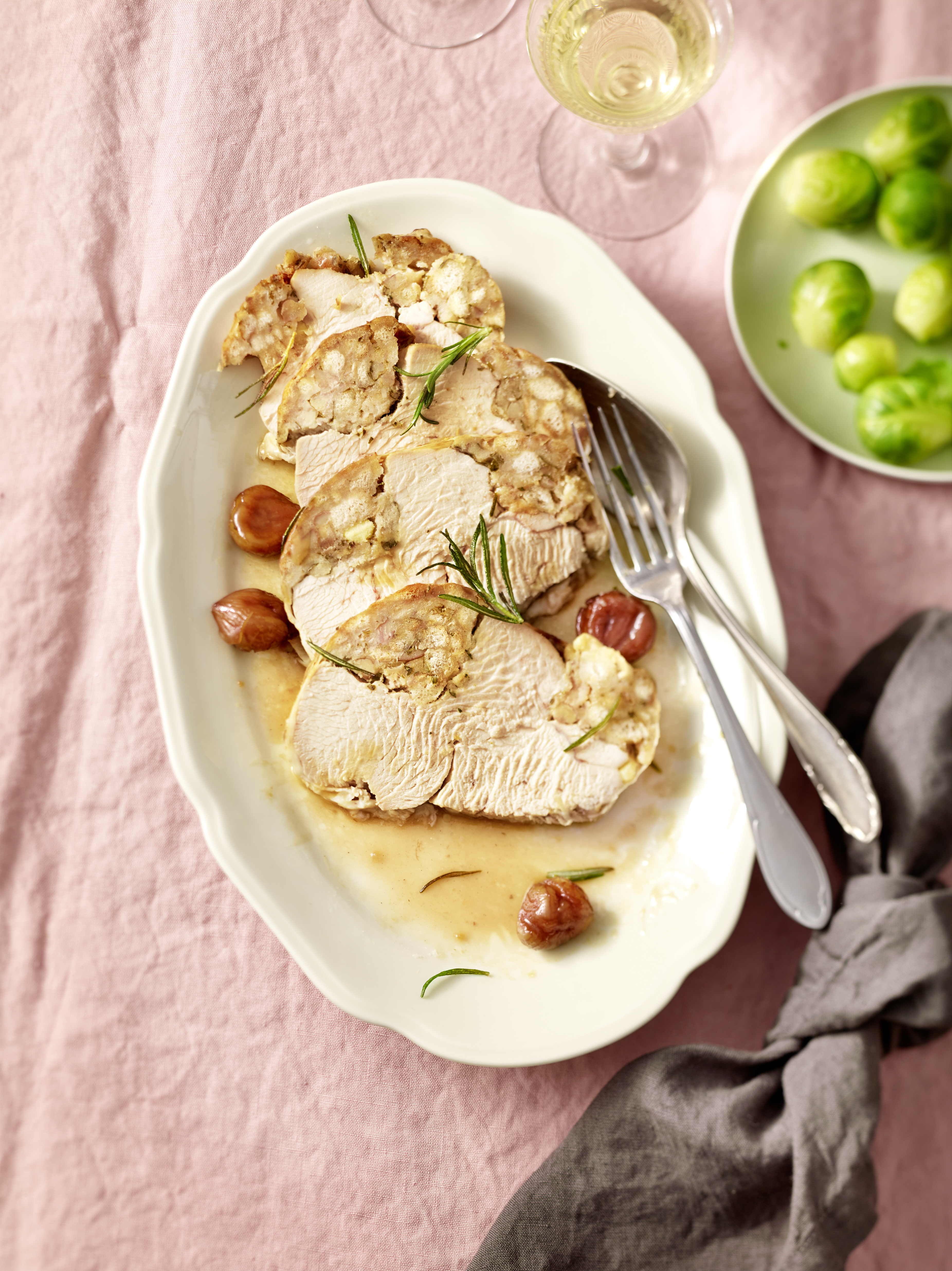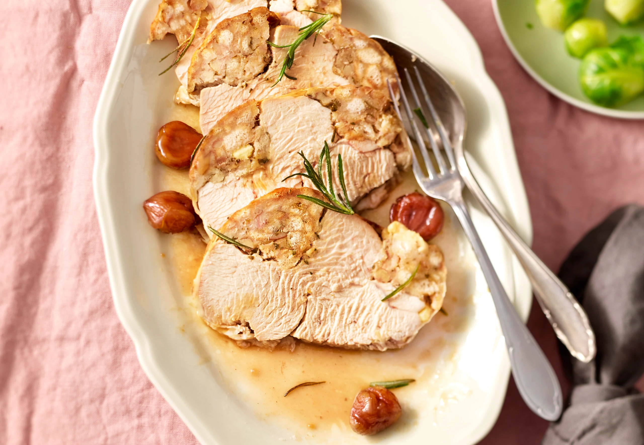 Für die Fülle Apfel schälen, Kerngehäuse ausstechen und das Fruchtfleisch in ca. 1 cm große Stücke schneiden. Maroni vierteln. Milch mit Butter aufkochen und über die Semmelwürfel gießen. Apfel, Maroni, Petersilie und Ei untermischen. Masse mit Salz, Pfeffer und Muskat würzen und ca. 30 Minuten ziehen lassen.