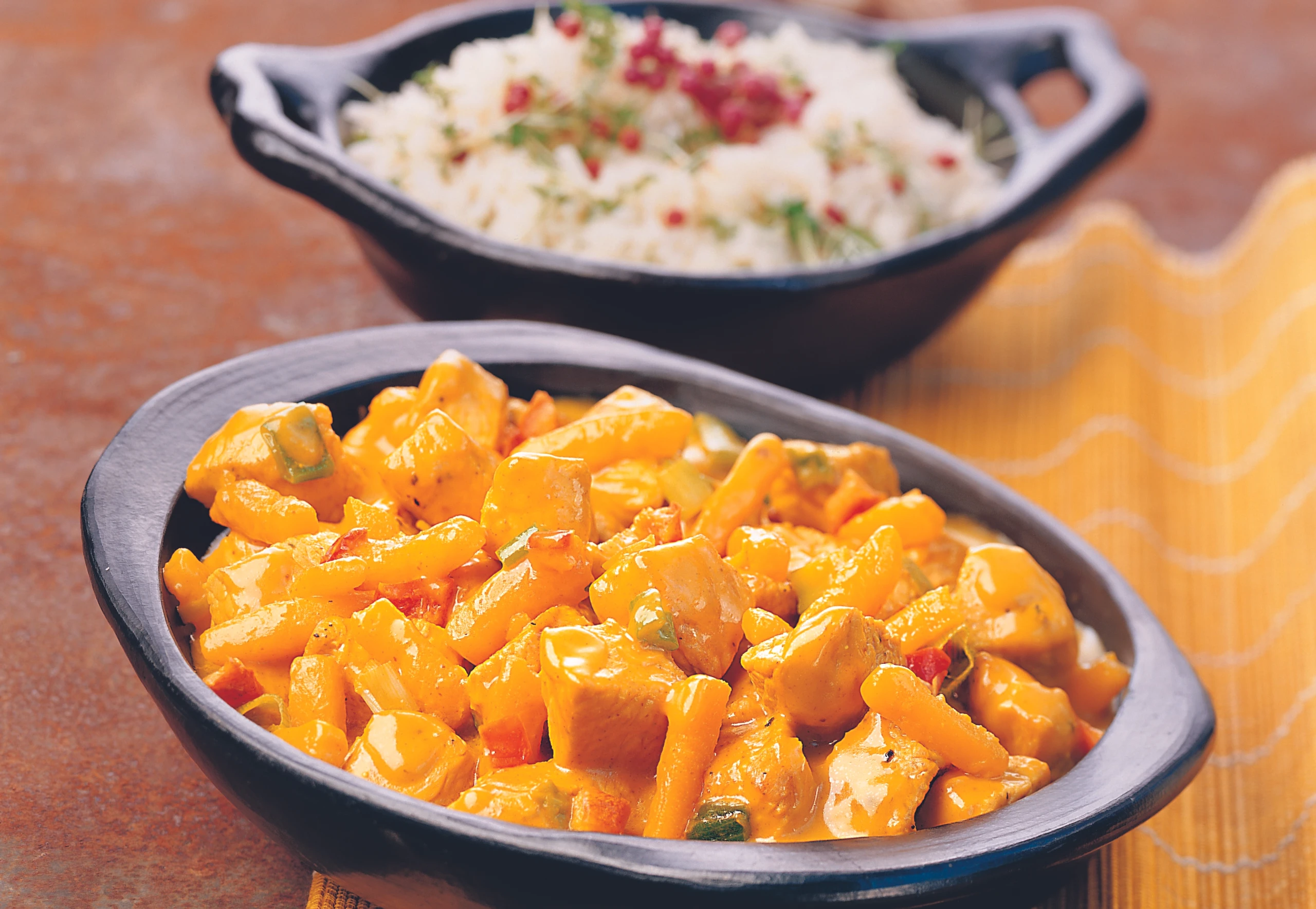 Curry einrühren und unter öfterem Rühren 5 Minuten köcheln. Gegen Ende der Garzeit Crème fraîche einrühren. Fleisch untermischen und kurz ziehen lassen.