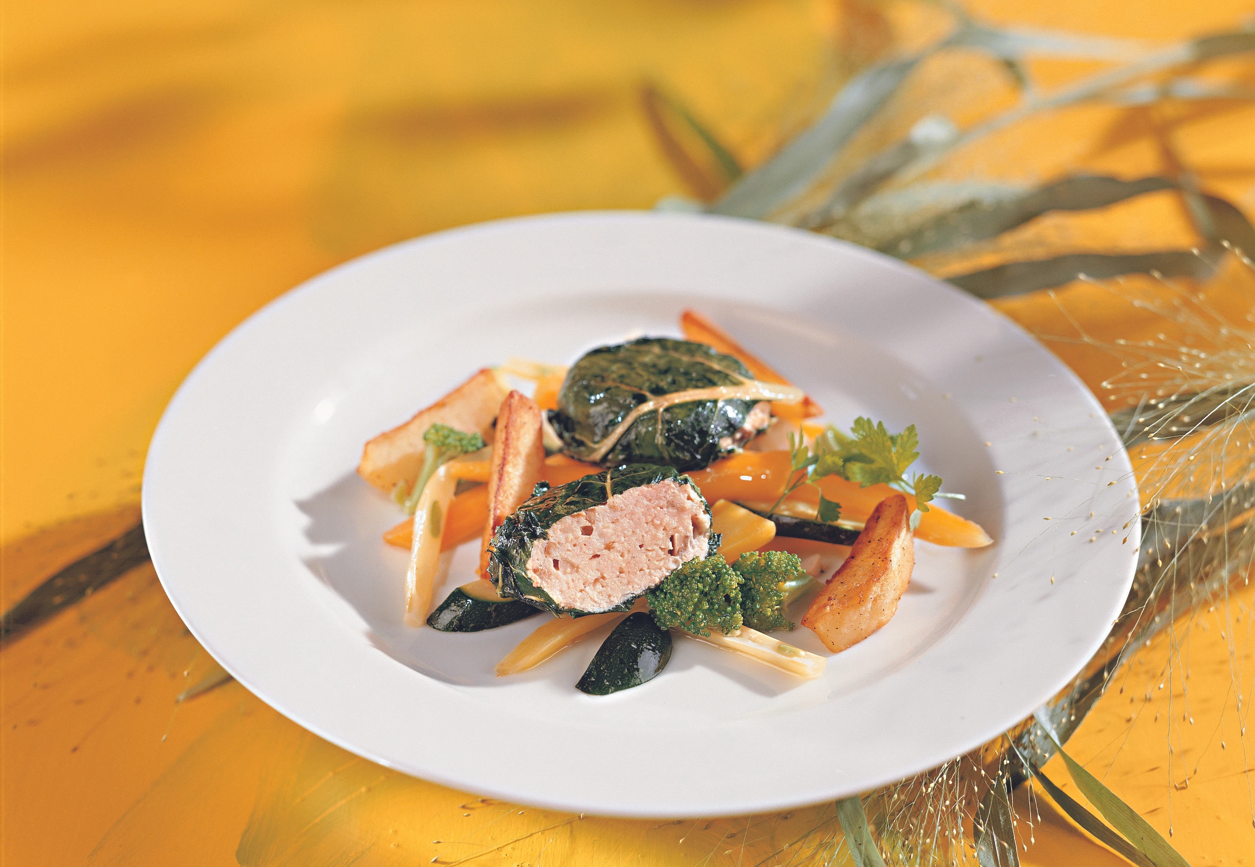 Putenfaschiertes im Mangoldblatt mit Butter-Gemüse