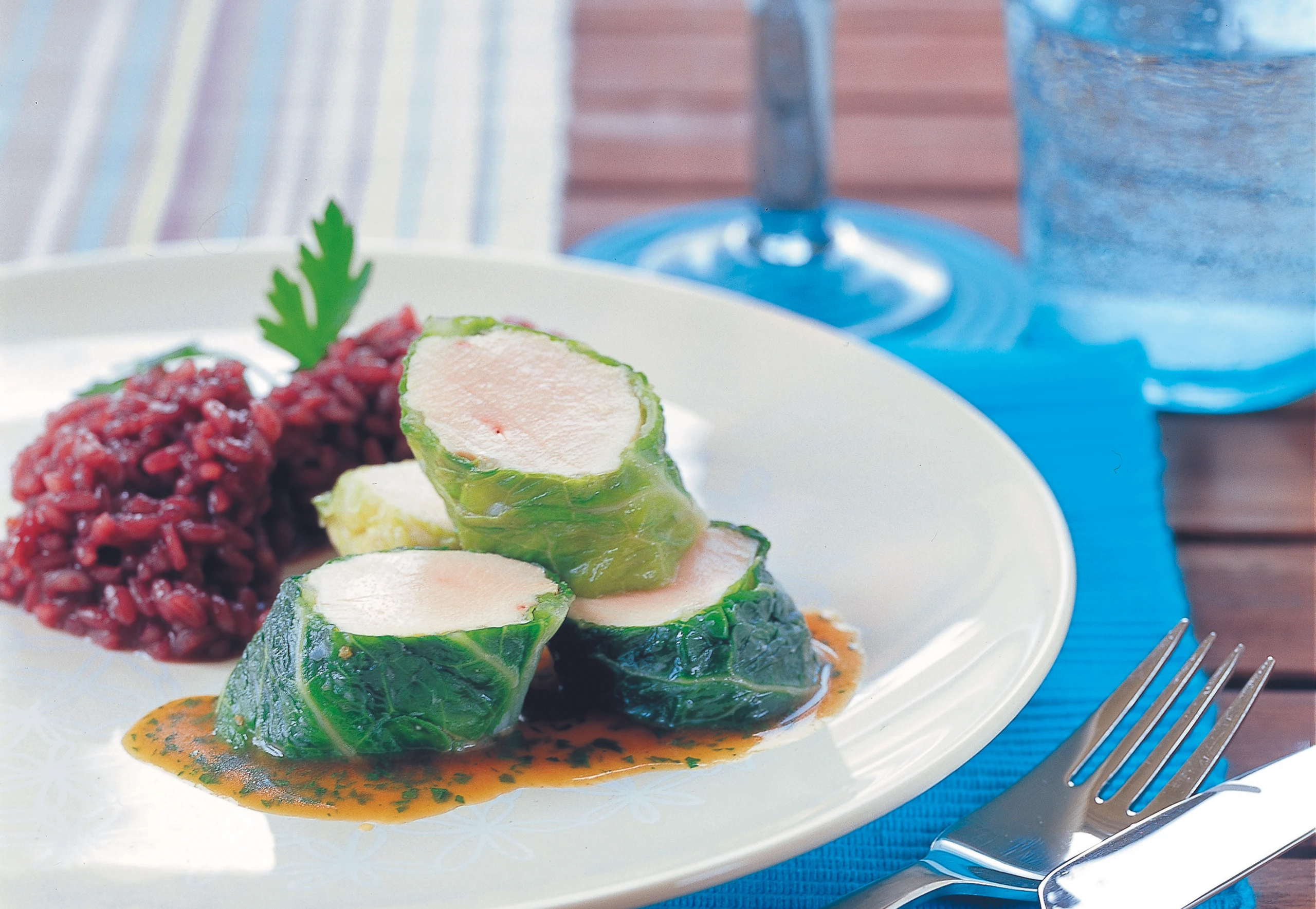 Putenbrust in 4 gleich dicke Streifen schneiden und mit Salz und Pfeffer würzen. Kohlblätter auflegen, Putenfilets darauf legen, einrollen und mit Spagat binden.