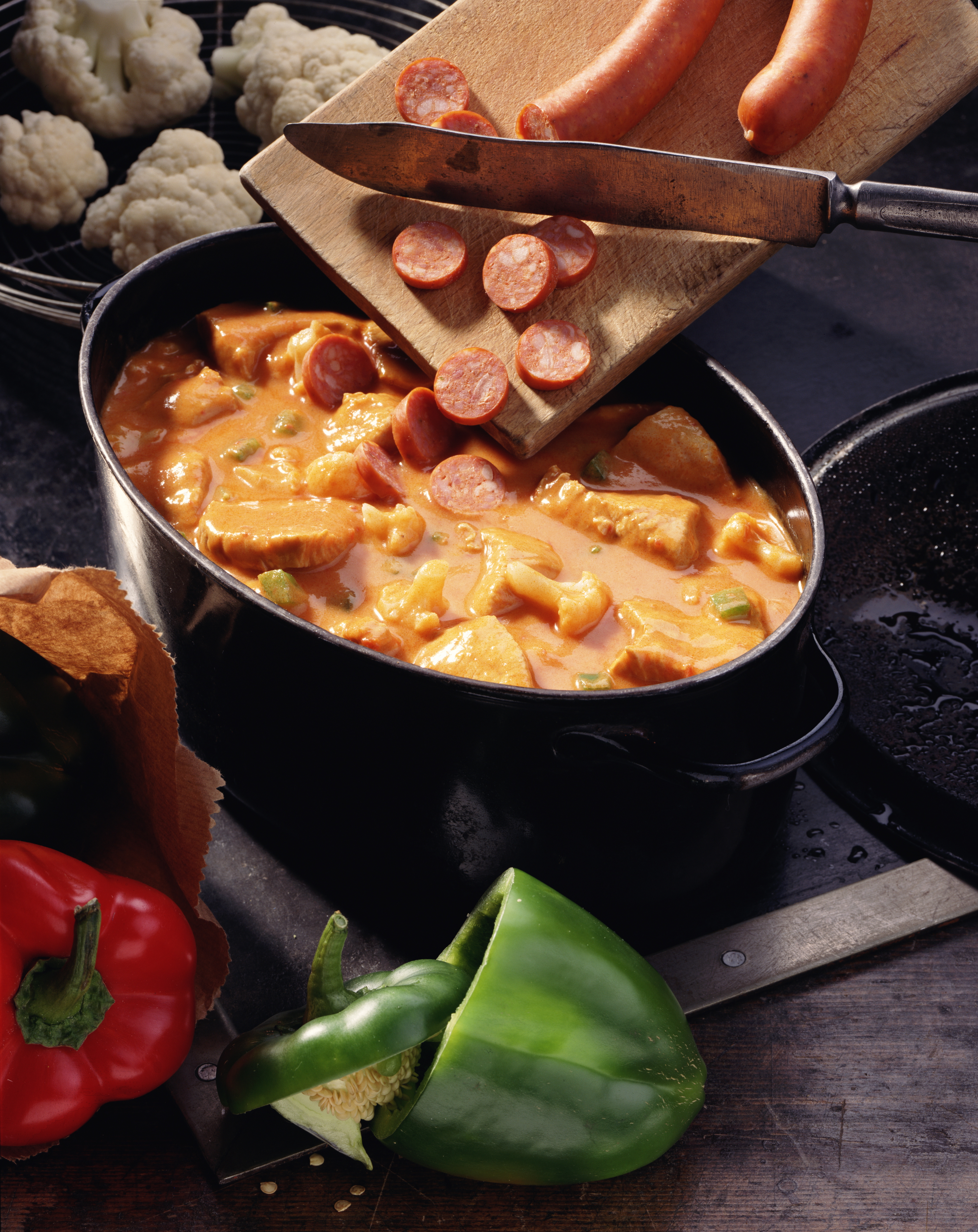Putenfleisch in ca. 3 cm große Stücke schneiden. Zwiebeln schälen und hacken. Paprika von Strünken und Kernen befreien, waschen und kleinwürfelig schneiden.