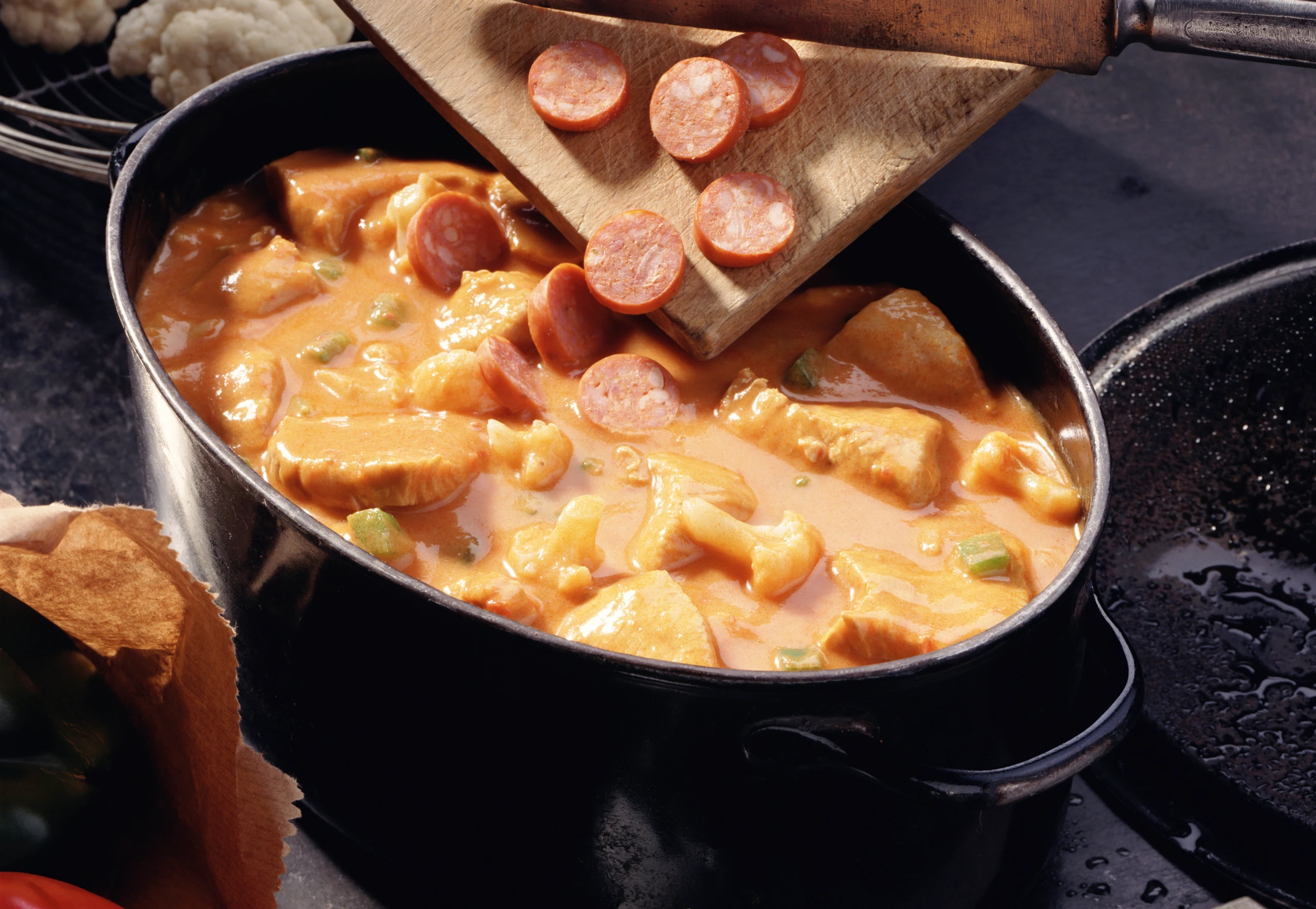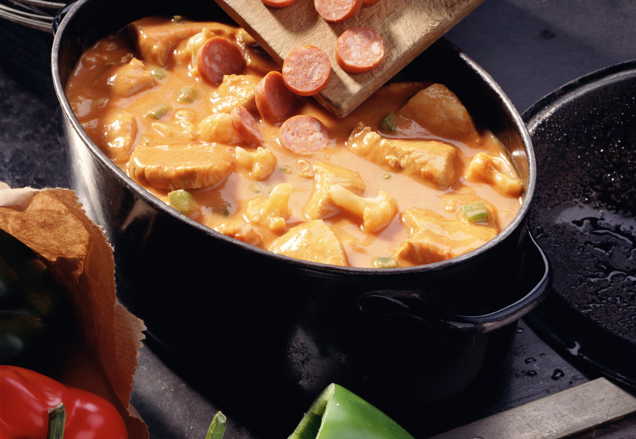 Fleisch mit einem Siebschöpfer aus der Sauce heben und beiseitestellen. Sauerrahm mit 1 EL Mehl verquirlen und in den Gulaschsaft rühren. Sauce ca. 4 Minuten köcheln. Fleisch, Wurst und Gemüse untermischen und auf kleiner Flamme wärmen. Als Beilagen serviert man am besten Baguette und Salat.