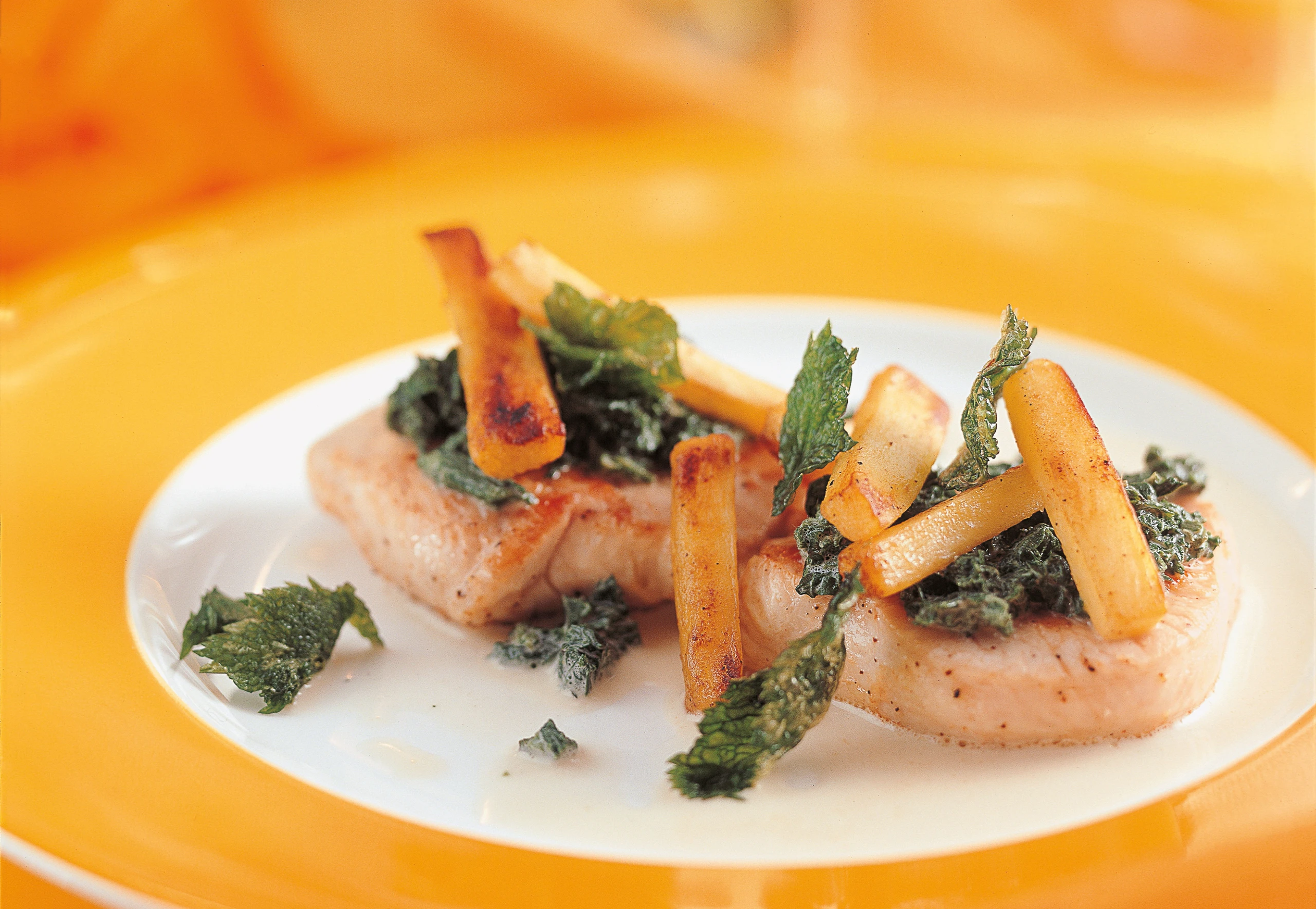 Putenmedaillons mit Brennnesselsauce und Pastinaken