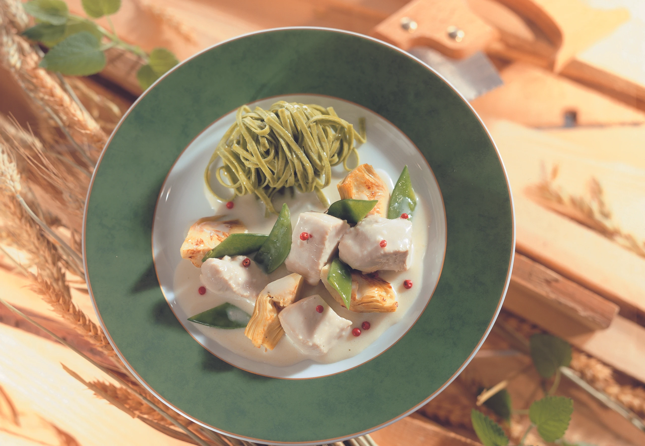 Putenragout mit Artischocken und Erbsenschoten