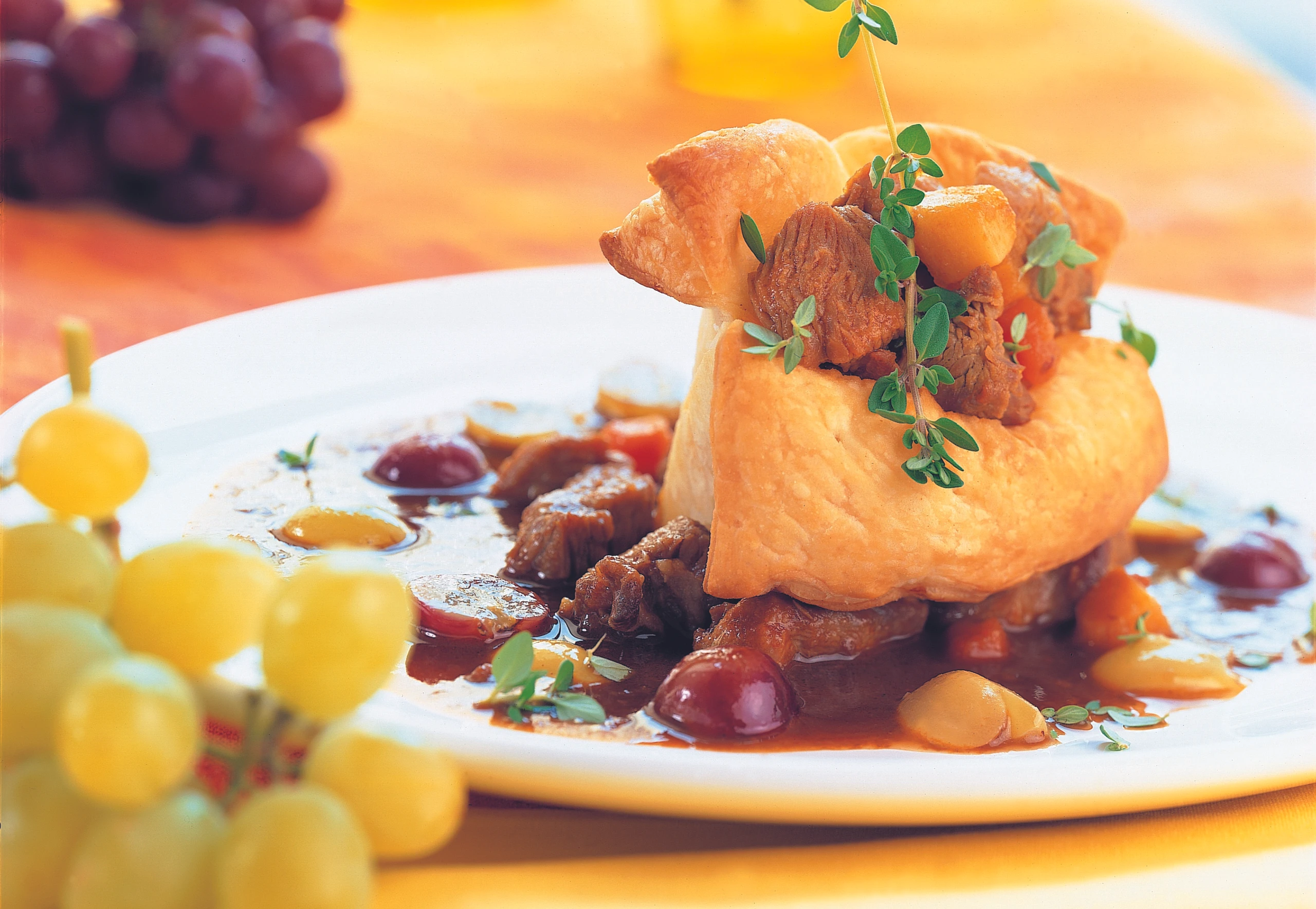 Ragout durch Einrühren der Butter verfeinern. Mit Trauben und Teigschüsserl servieren.