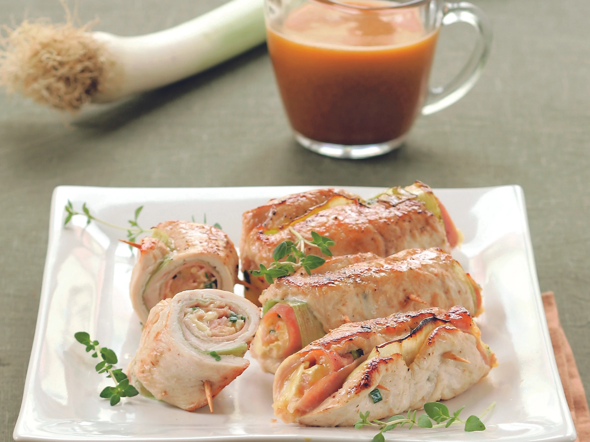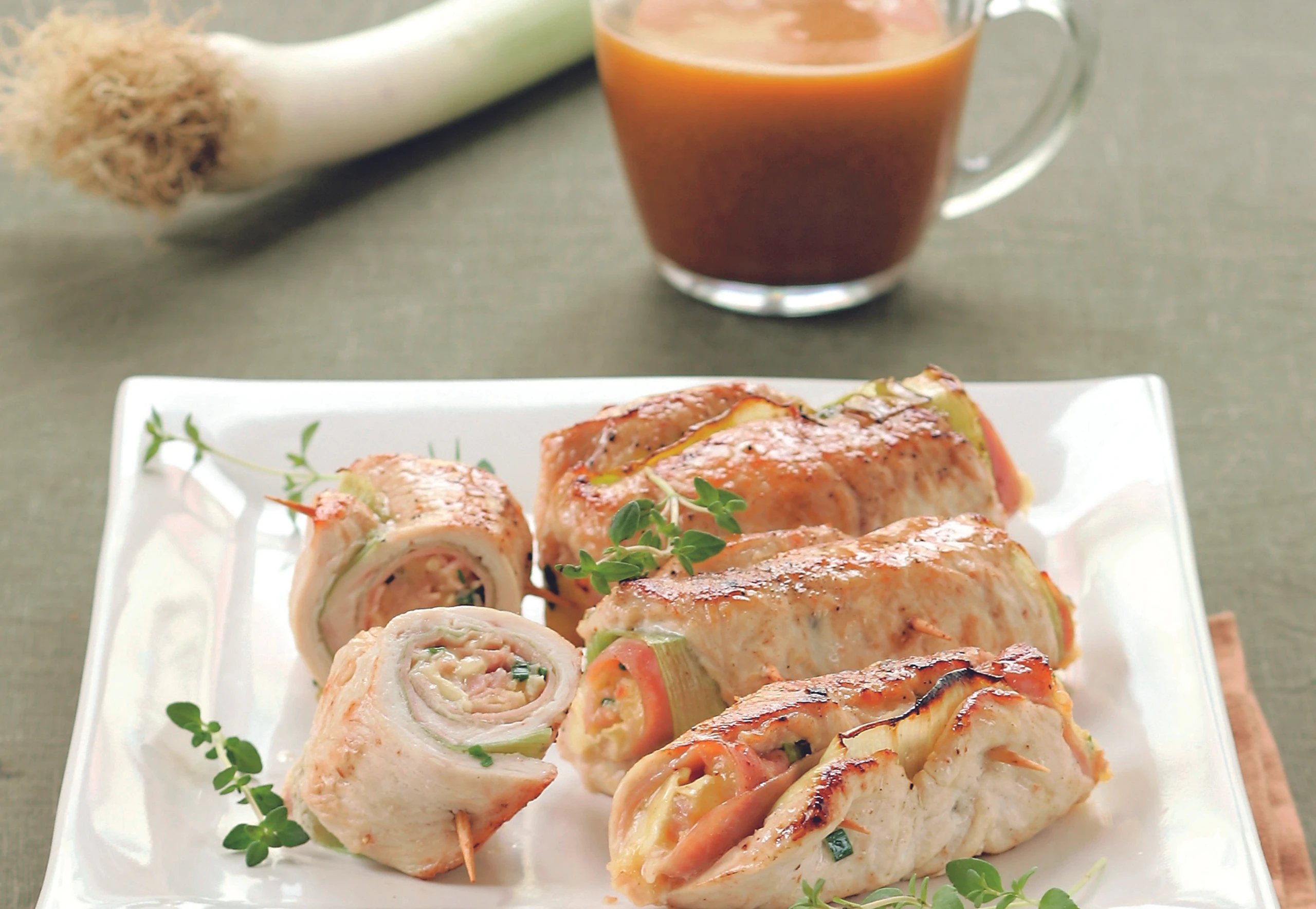 Rohr auf 180°C vorheizen. Steaks klopfen, mit Lauch und Schinkenblättern belegen. Fülle darauf verstreichen, Steaks einrollen und mit Zahnstochern fixieren.