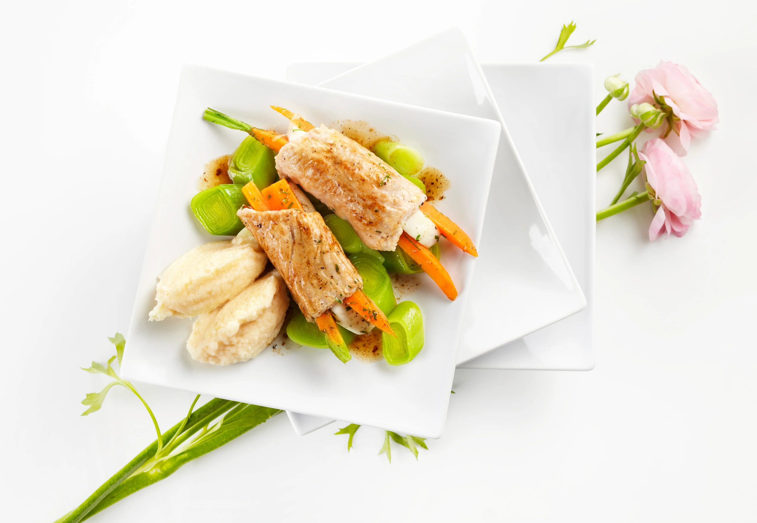 Putenröllchen mit Lauch und Pastinakenpüree