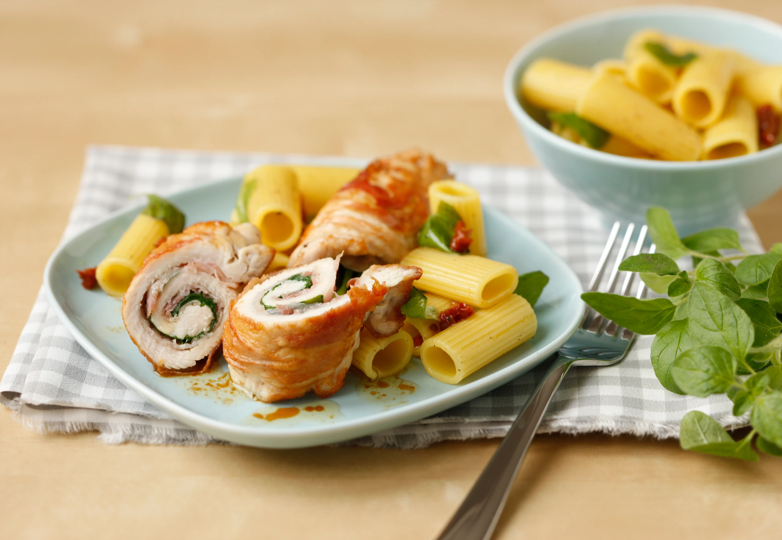 - Röllchen aus dem Rohr nehmen, Zahnstocher entfernen. Röllchen quer halbieren und mit den Rigatoni anrichten.