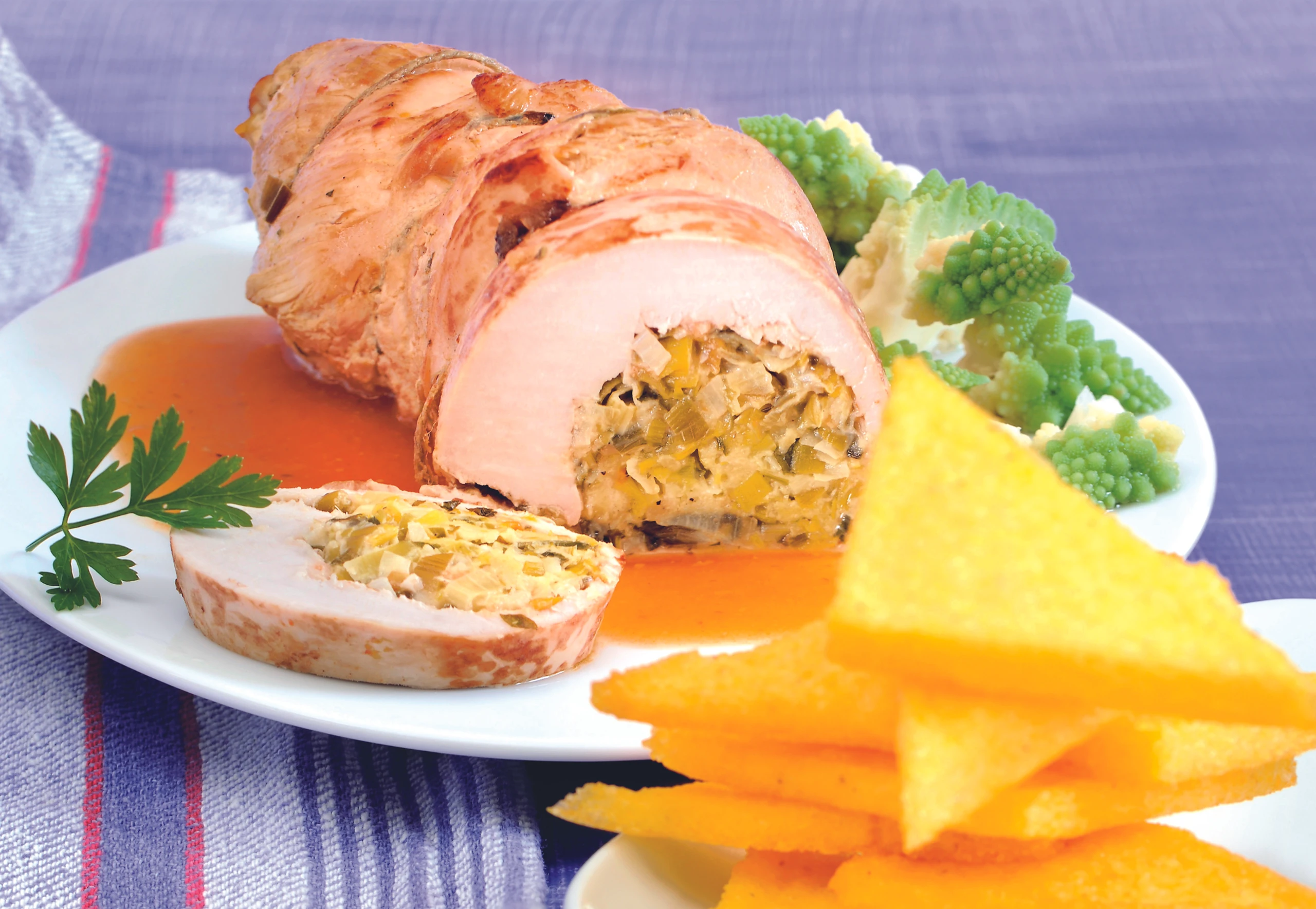 - Fleisch so aufschneiden, dass ein großes Stück entsteht, etwas flach klopfen und salzen. Senf und Marmelade verrühren, Fleisch auf einer Seite damit bestreichen. Füllung darauf verstreichen. Fleisch längs einrollen, mit Küchengarn zusammenbinden, Enden zusammennähen.