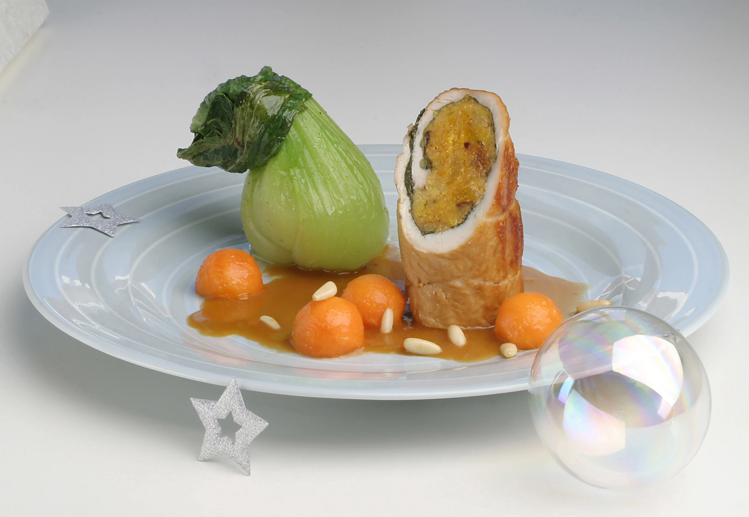 Putenroulade mit Polenta-Fruchtfülle auf Pak-Choi