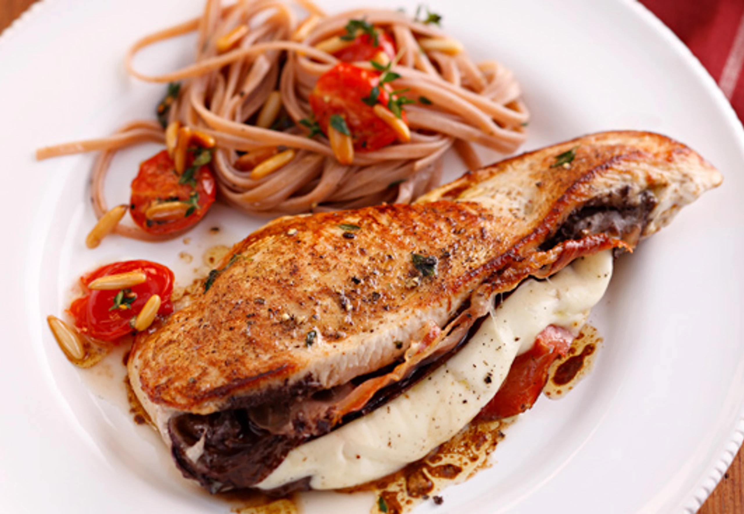 Putenschnitzel mit Mozzarella-Olivenfülle und Pasta