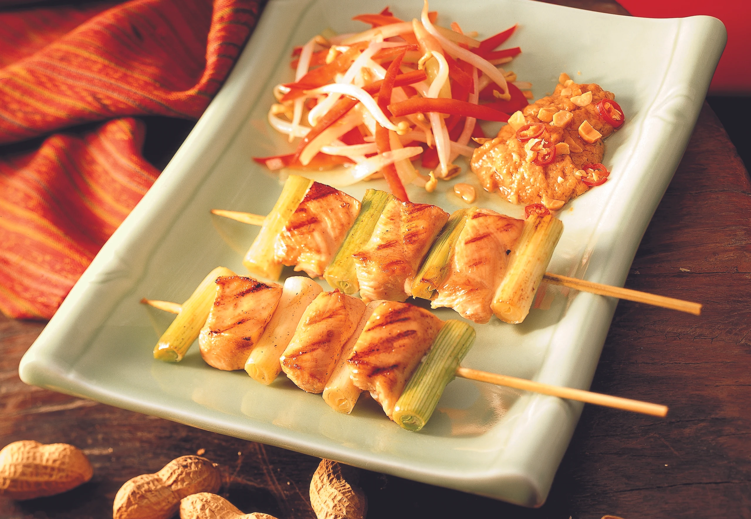 Putenspießchen mit Erdnuss-Kokossauce und Sprossen-Paprikasalat