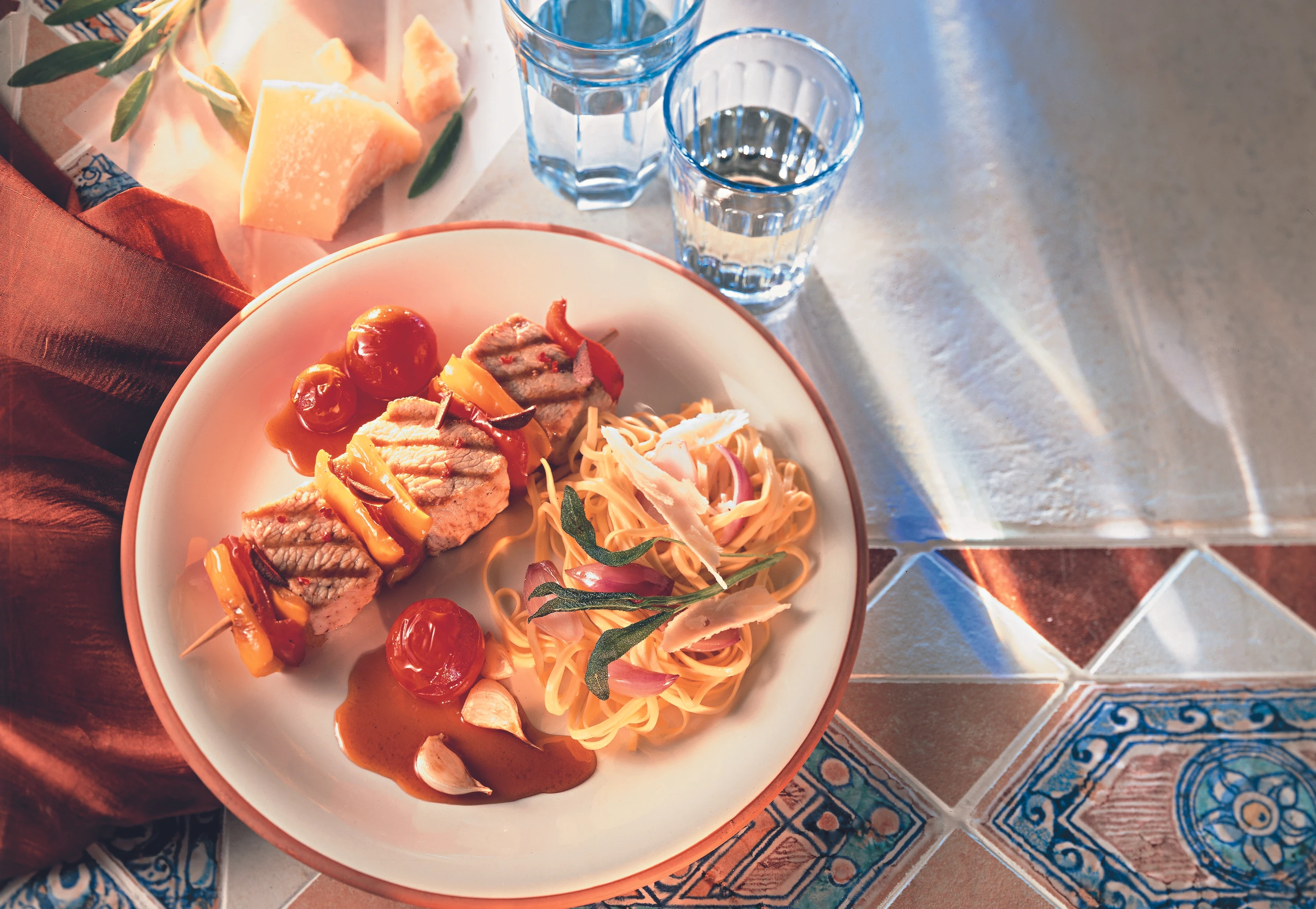 Pfefferoni kleinwürfelig schneiden und mit 2–3 EL Öl verrühren. Putenbrust in zwölf gleichgroße Stücke schneiden, mit der Marinade vermischen, mit Frischhaltefolie zudecken und ca. 2 Stunden ziehen lassen.