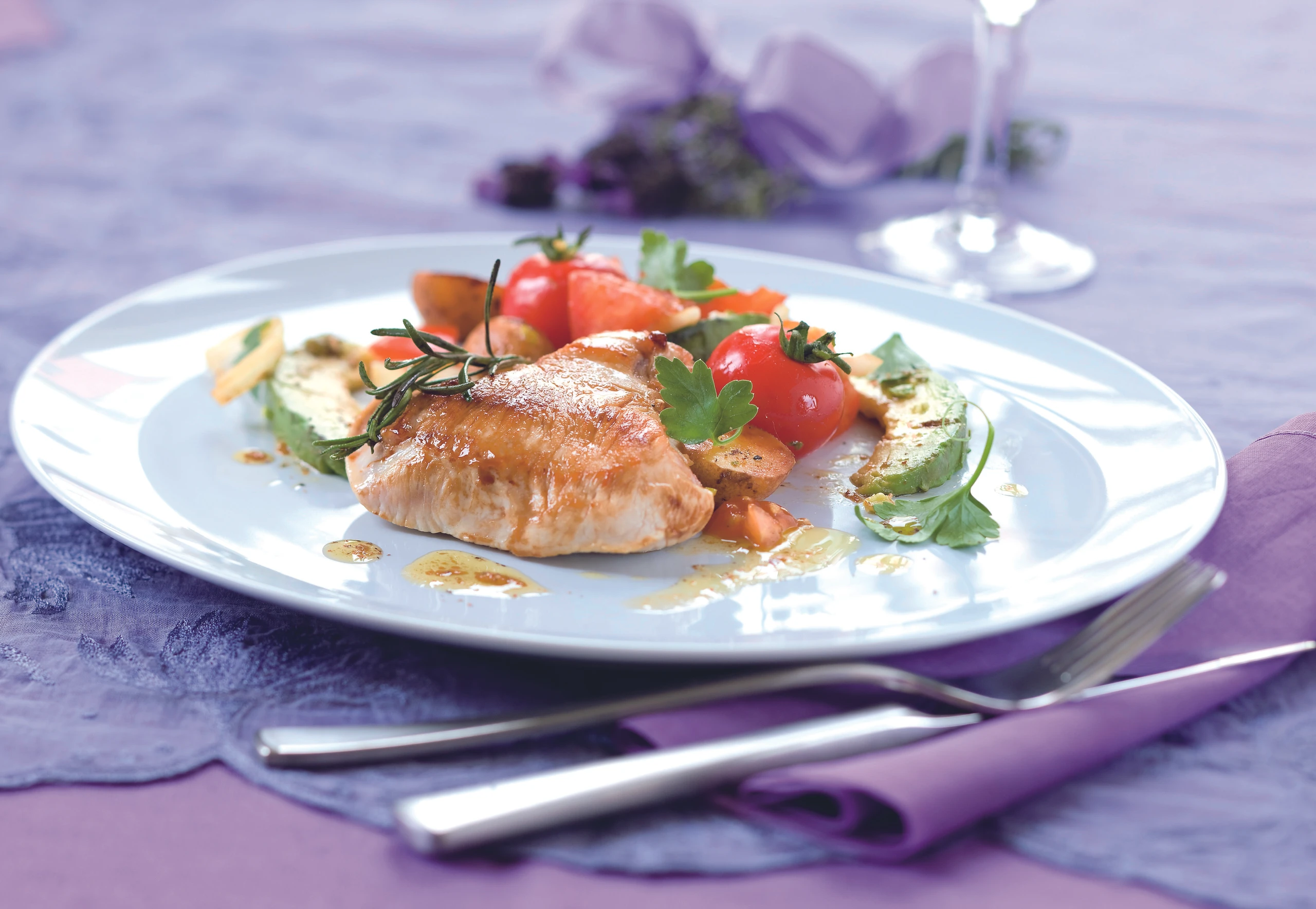Putensteaks in 3 EL Olivenöl beidseitig braten (gesamt ca. 1 Minute). Steaks mit Gemüse anrichten, mit Petersilie und Rosmarin garnieren.