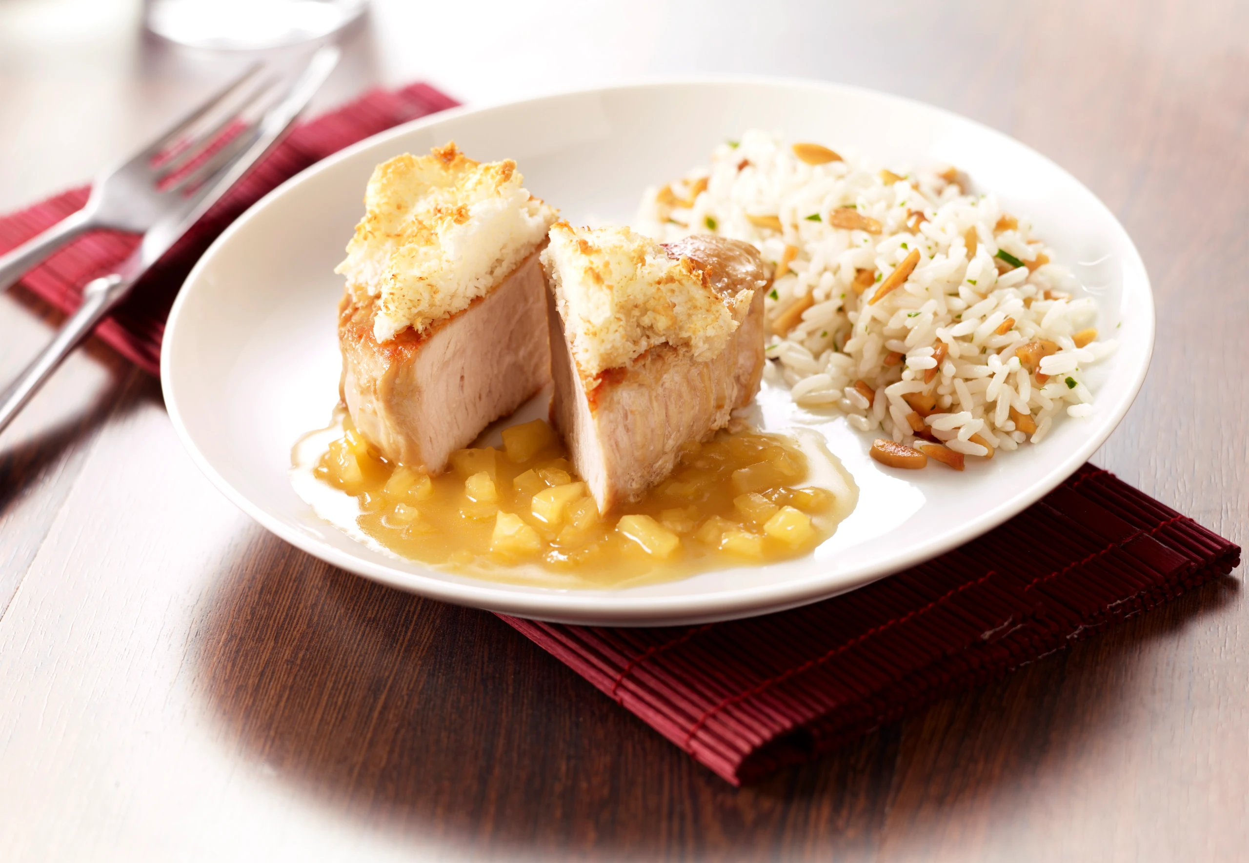 Rohr auf Grillstellung vorheizen. Steaks klopfen, salzen, pfeffern, in 3 EL Öl beidseitig braten und in eine Auflaufform geben. Kokosmasse darauf verteilen. Steaks im Rohr (mittlere Schiene / Gitterrost) überbacken.