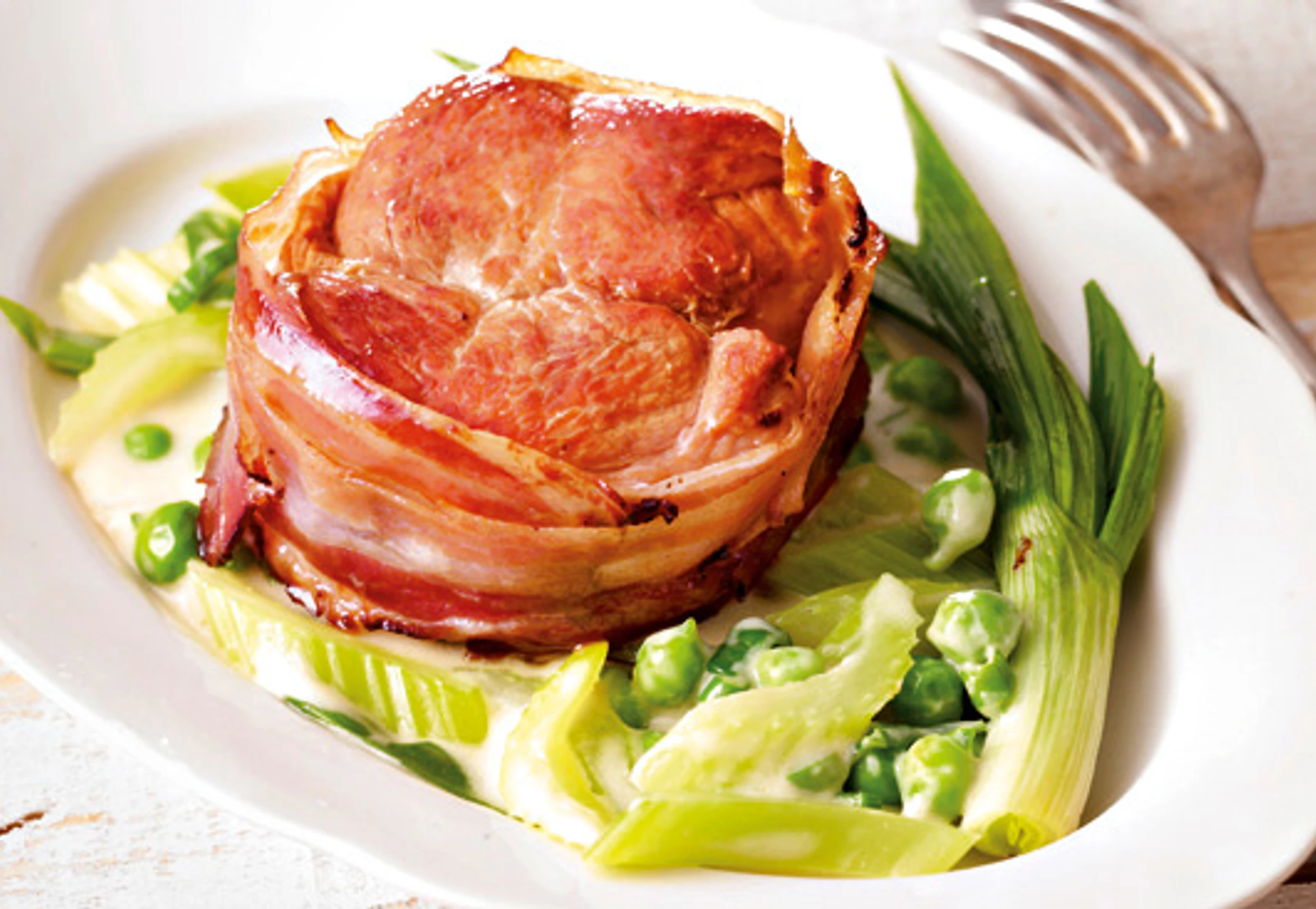 Fleisch salzen, pfeffern und mit je 2 Scheiben Speck umwickeln. In einer Pfanne das Öl erhitzen, Fleisch darin auf beiden Seiten bei mittlerer Hitze je ca. 8 Minuten braten.