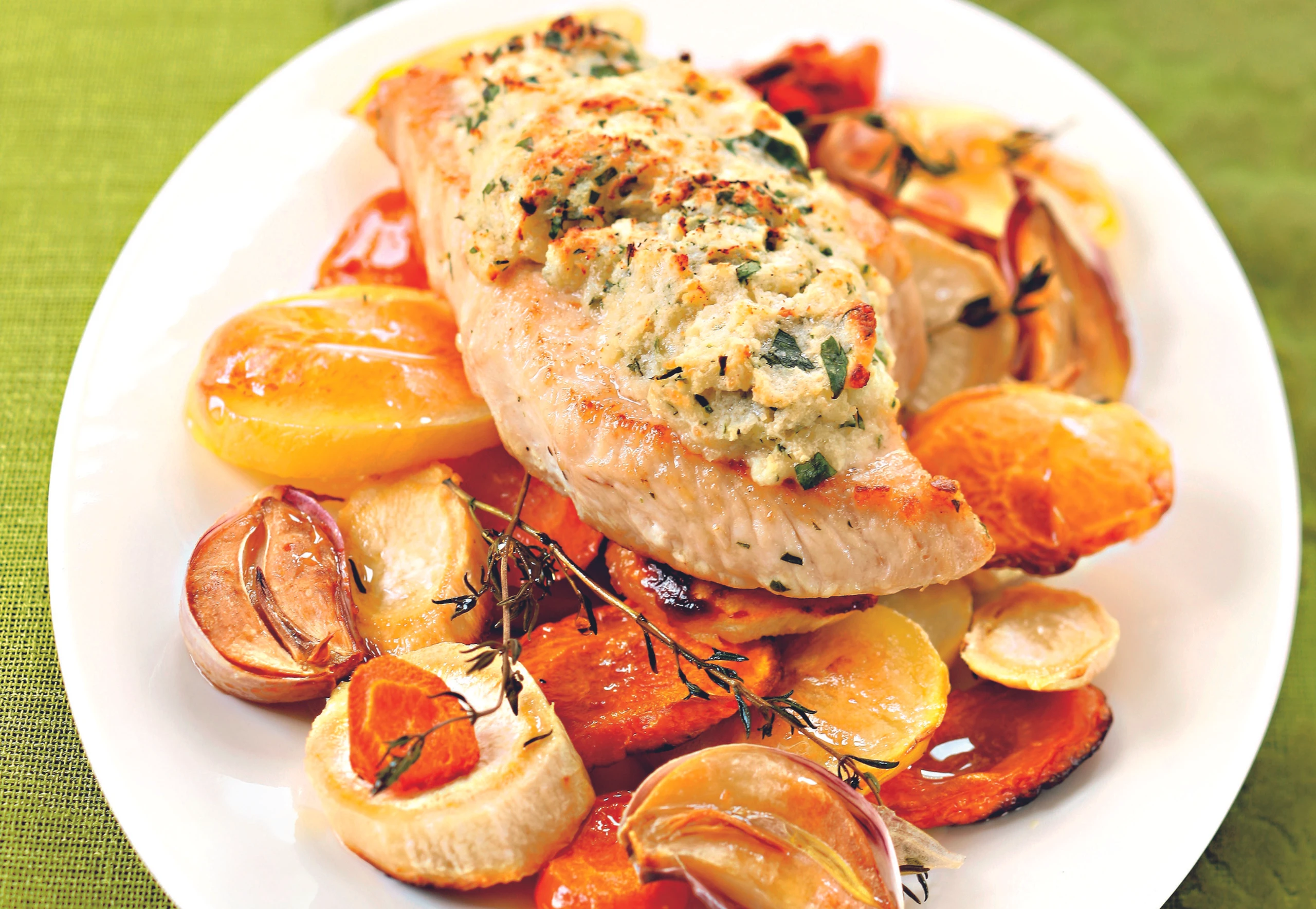 Gemüse und Knoblauch schälen und in cm dicke Scheiben schneiden. Mit 4 EL Öl, Salz, Pfeffer und Thymian mischen, auf dem Blech verteilen und im Rohr 40 Minuten braten.