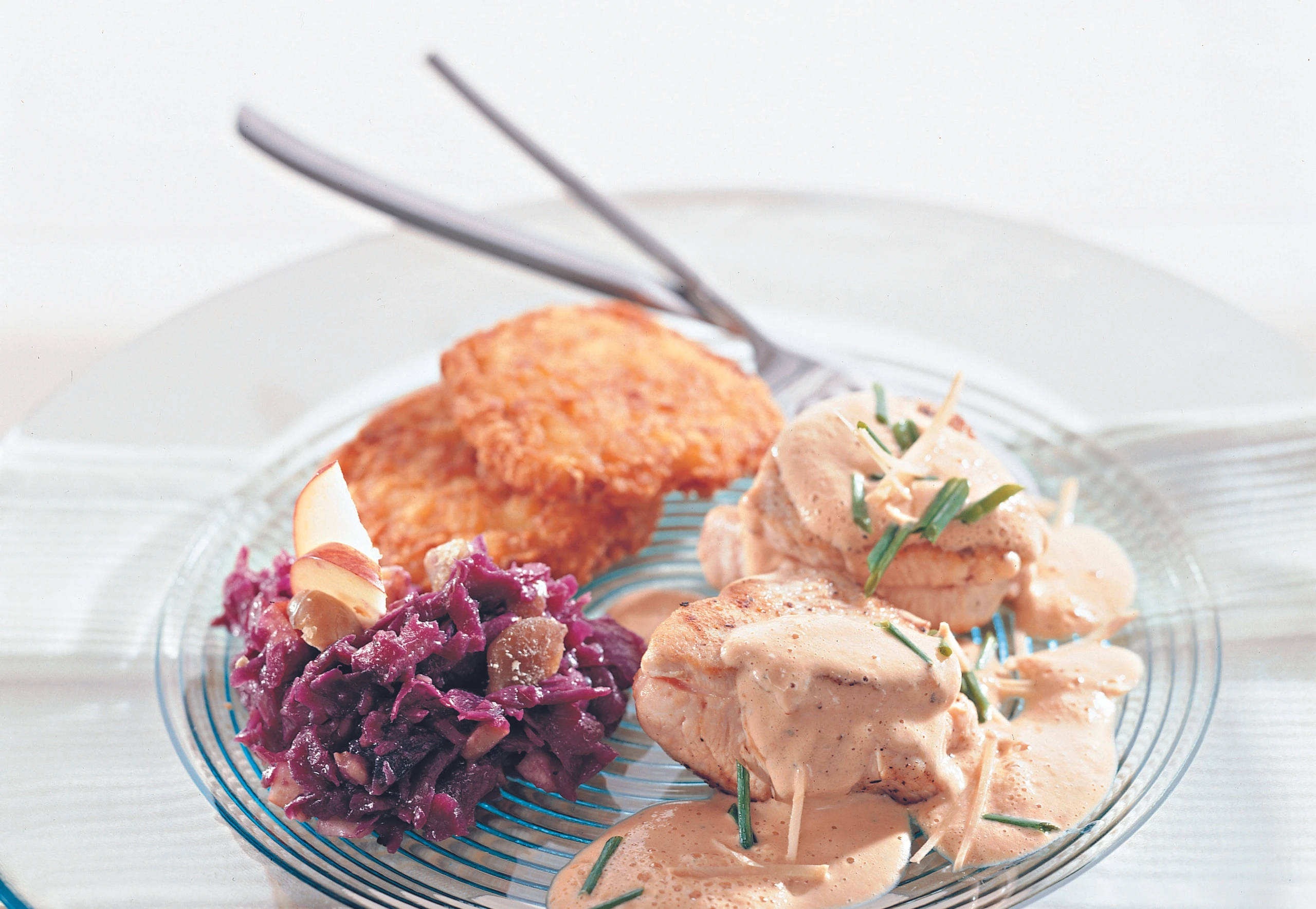 Im Bratrückstand Zwiebel und Ingwer anschwitzen, mit Wein ablöschen und kurz einkochen. Ausgetretenen Saft von den Steaks zur Sauce gießen. Sauce erhitzen, Butter einrühren; Saucen nicht mehr kochen. Creme fraîche und Schnittlauch einrühren, Sauce salzen und pfeffern. Steaks mit Sauce anrichten. Dazu passen Erdäpfelpuffer und Rotkraut.
