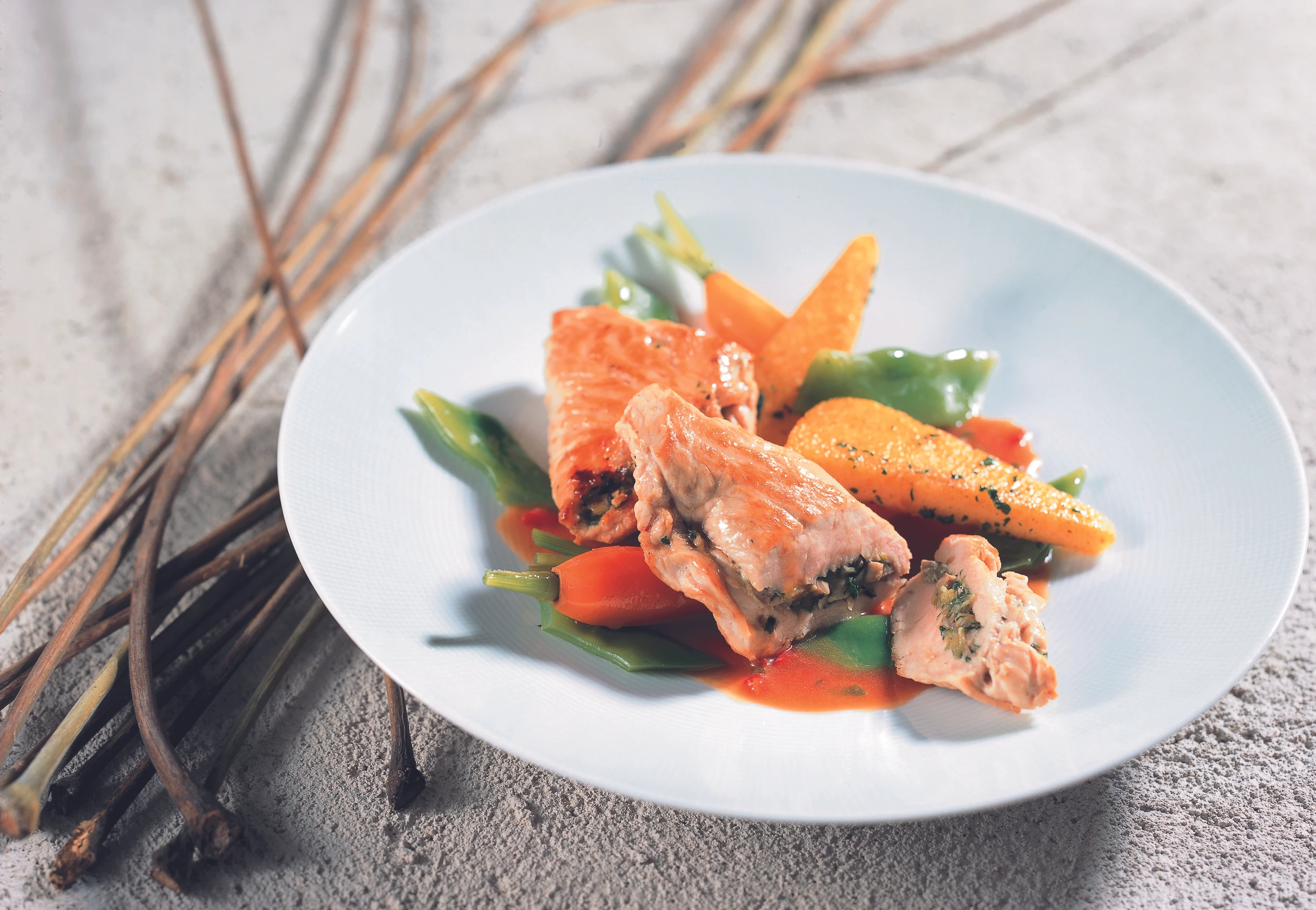 Putentascherl mit Karotten-Fisolen-Gemüse und gebratener Polenta