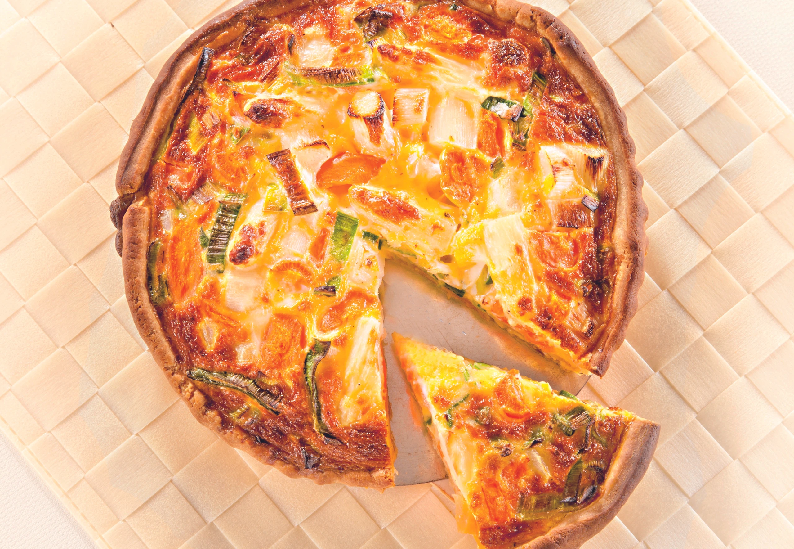 Milch, Obers und Eier verquirlen, salzen und pfeffern. Gemüse in der Form verteilen, mit der Eimischung übergießen. Quiche im Rohr (mittlere Schiene / Gitterrost) ca. 35 Minuten backen.