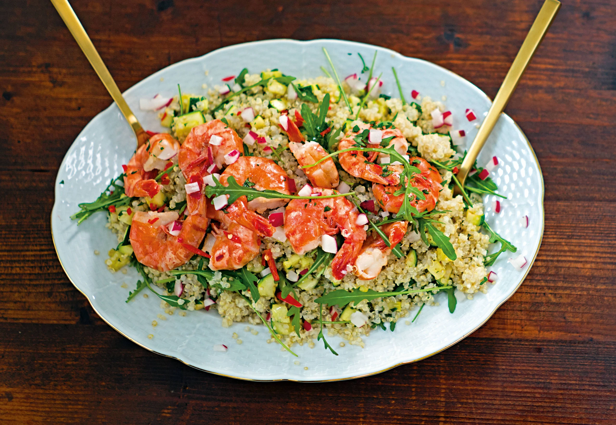 Im Bratrückstand Zucchini kurz anbraten, mit Salz, Pfeffer, Knoblauch, Kümmel und Chili würzen. Quinoa mit Zucchini, Kräutern, Garnelen und Rucola vermischen und mit Radieschen bestreut servieren.